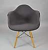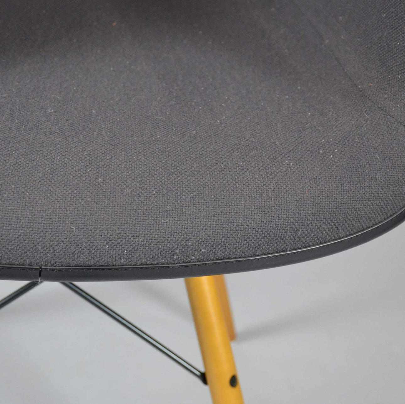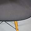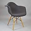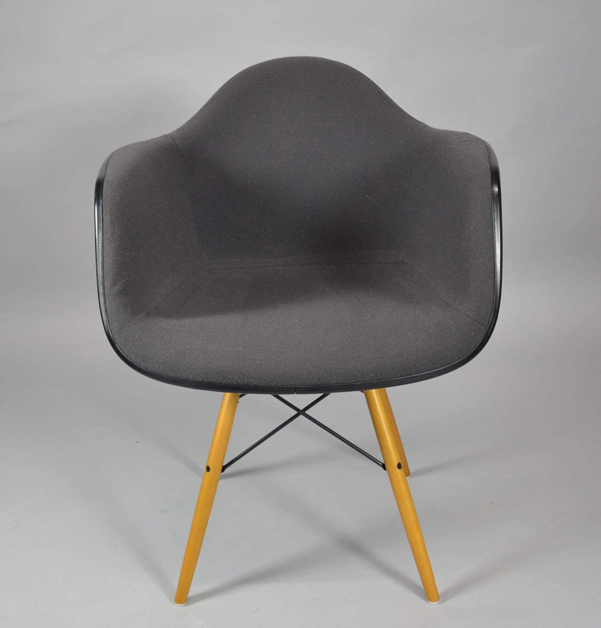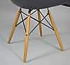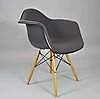 Gestell Holz mit Metallstreben. Sitzschale in Kunststoff voll gepolstert mit grauem Stoff.