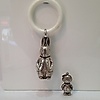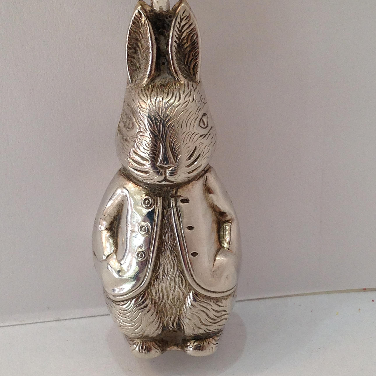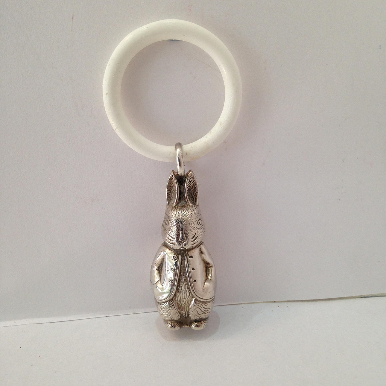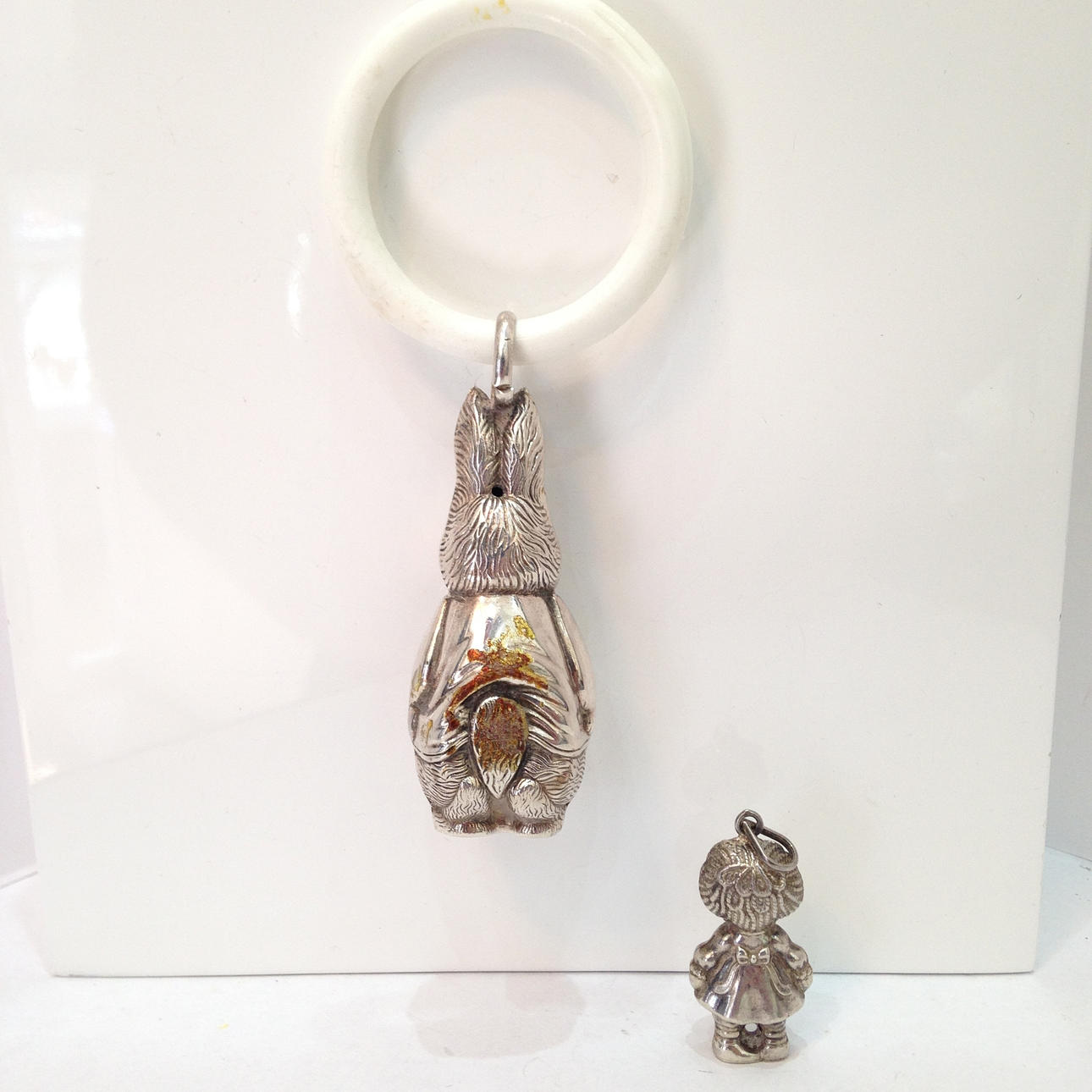 Dies ist ein versilberter Vintage-Peter-Kaninchen-Schnuller und ein Dolly-Anhänger.