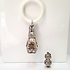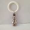 Der Schnuller ist ein versilberter Peterhase, der an einem weißen Beißring aus Kunststoff befestigt ist.