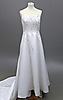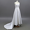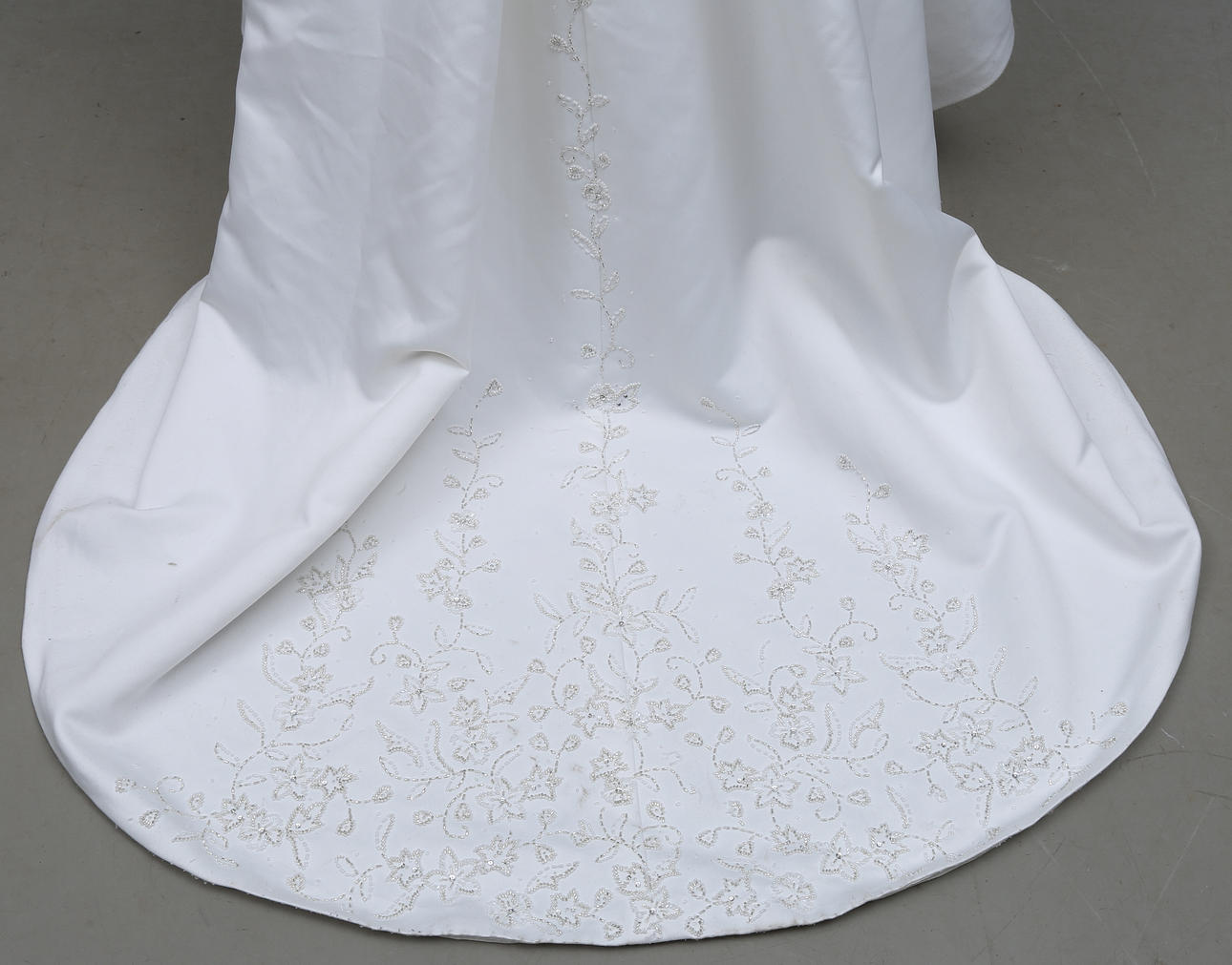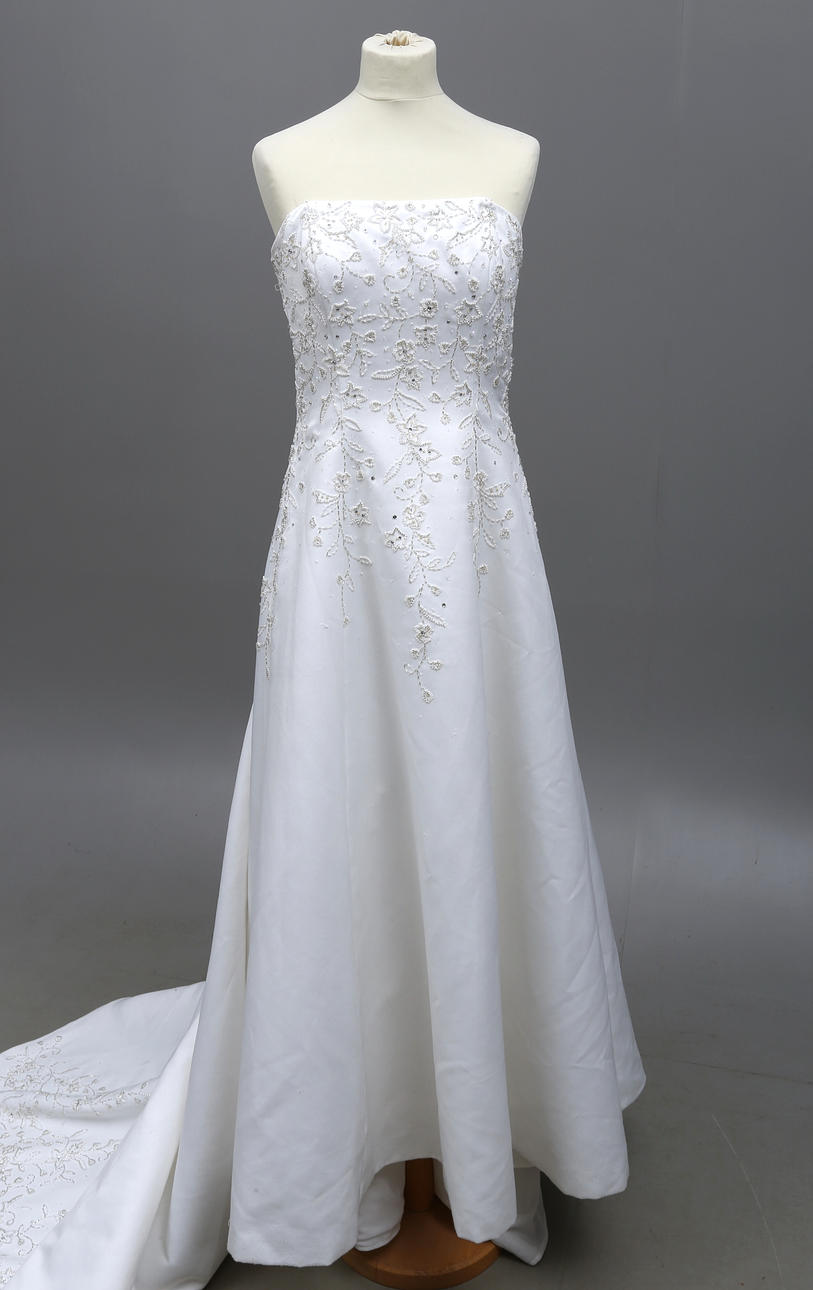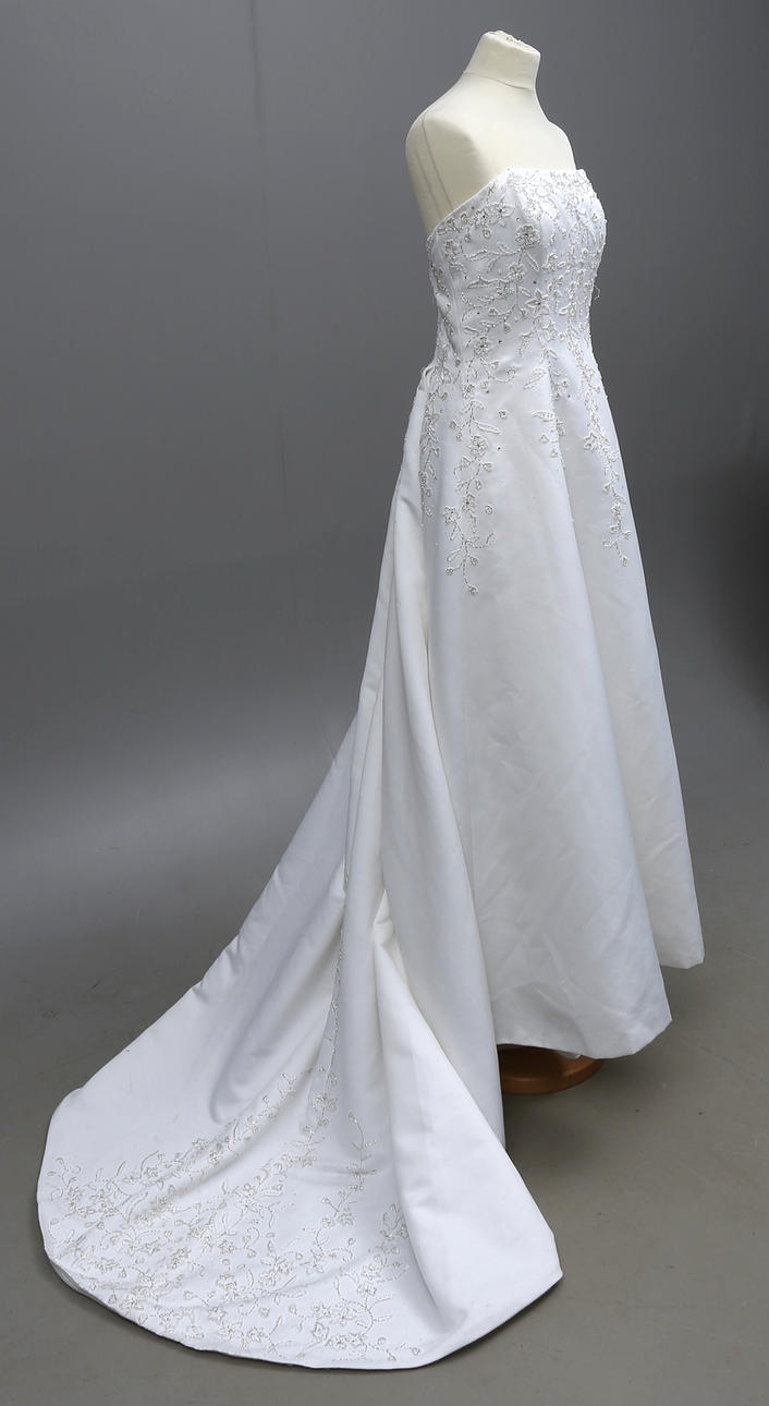 Kleid mit Schleppe und Perlenstickerei. Taille ca. 78 cm. Brustumfang ca. 85-87 cm. Vorderlänge ca. 132 cm.