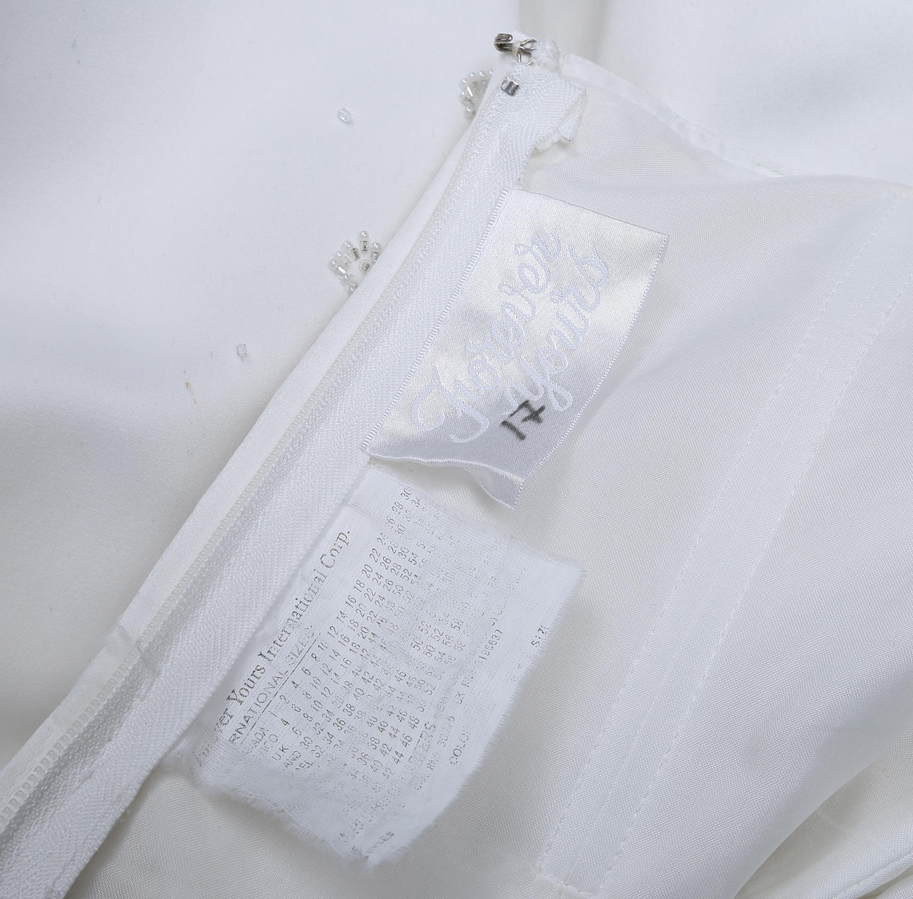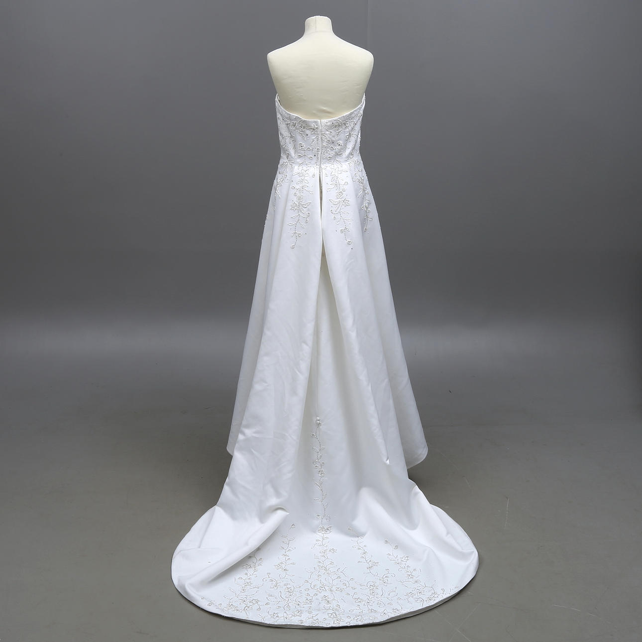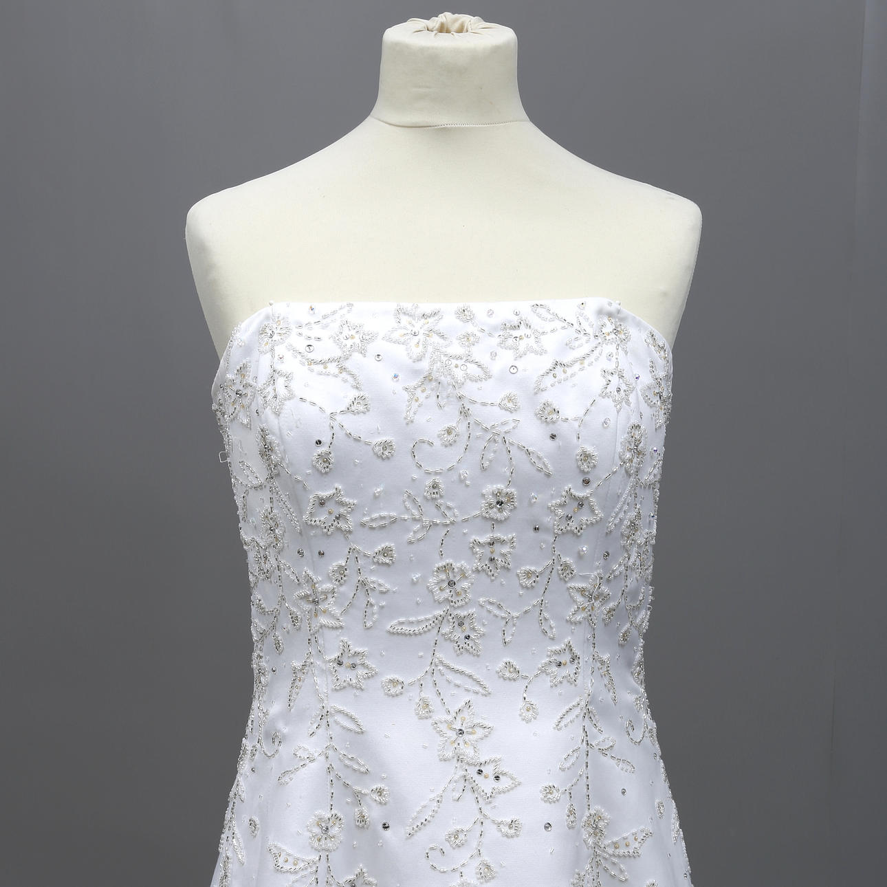 Kleid mit Schleppe und Perlenstickerei. Taille ca. 78 cm. Brustumfang ca. 85-87 cm. Vorderlänge ca. 132 cm.
