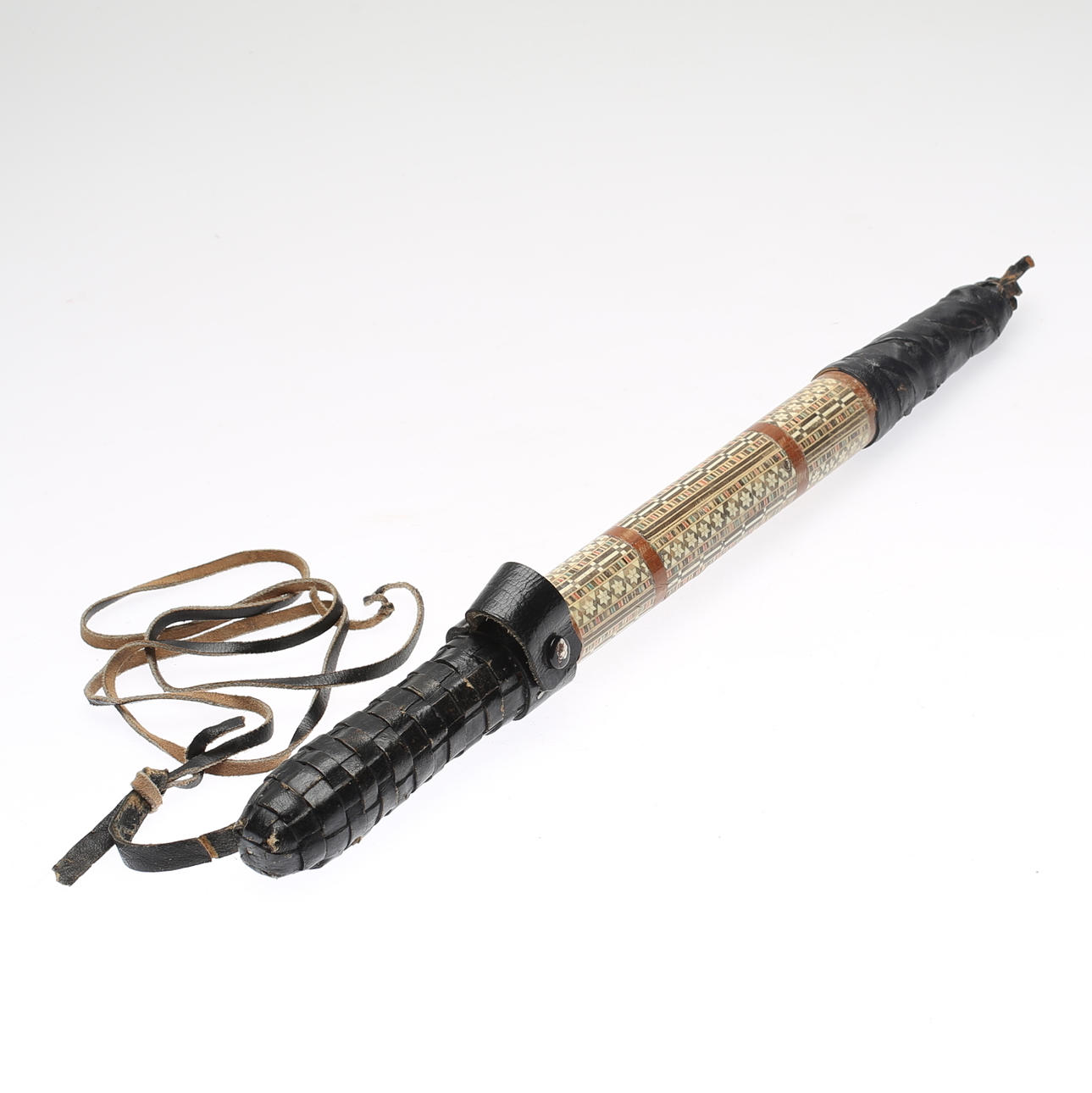 Holzschaft mit Intarsien. Geflochtenes Leder. Länge ohne Druckknopf ca. 43 cm.