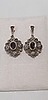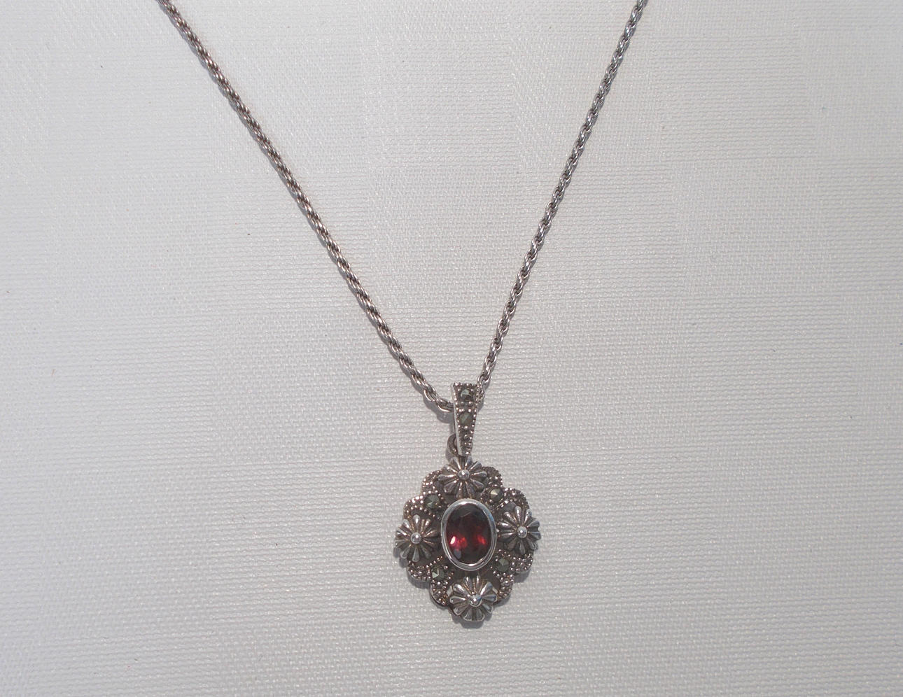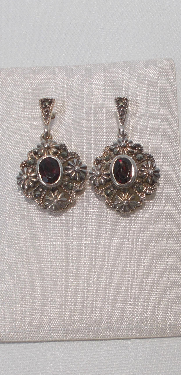 Antikes Silber 835 Schmuckset mit Granat an Kette und Ohrringe, Länge Ornament je etwa 3,2 x 1,8 cm, Länge Kette etwa 44 cm, um 1900.