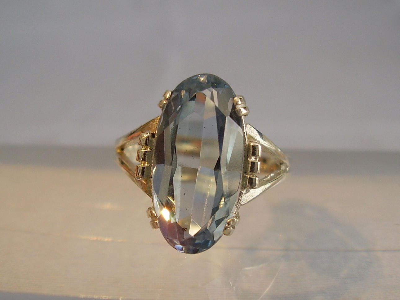 Der Ringkopf ist besetzt mit einem langovalen facettierten hellblauen Aquamarin-Spinell von ca. 4,5 ct.