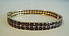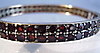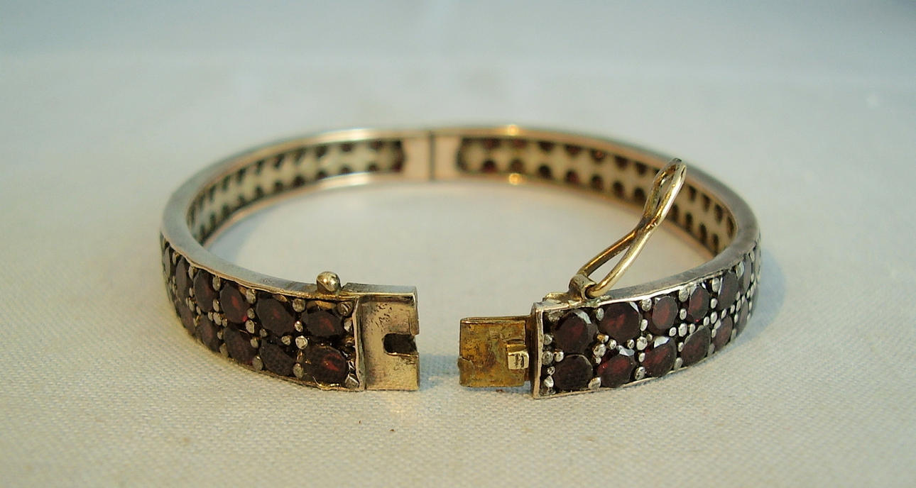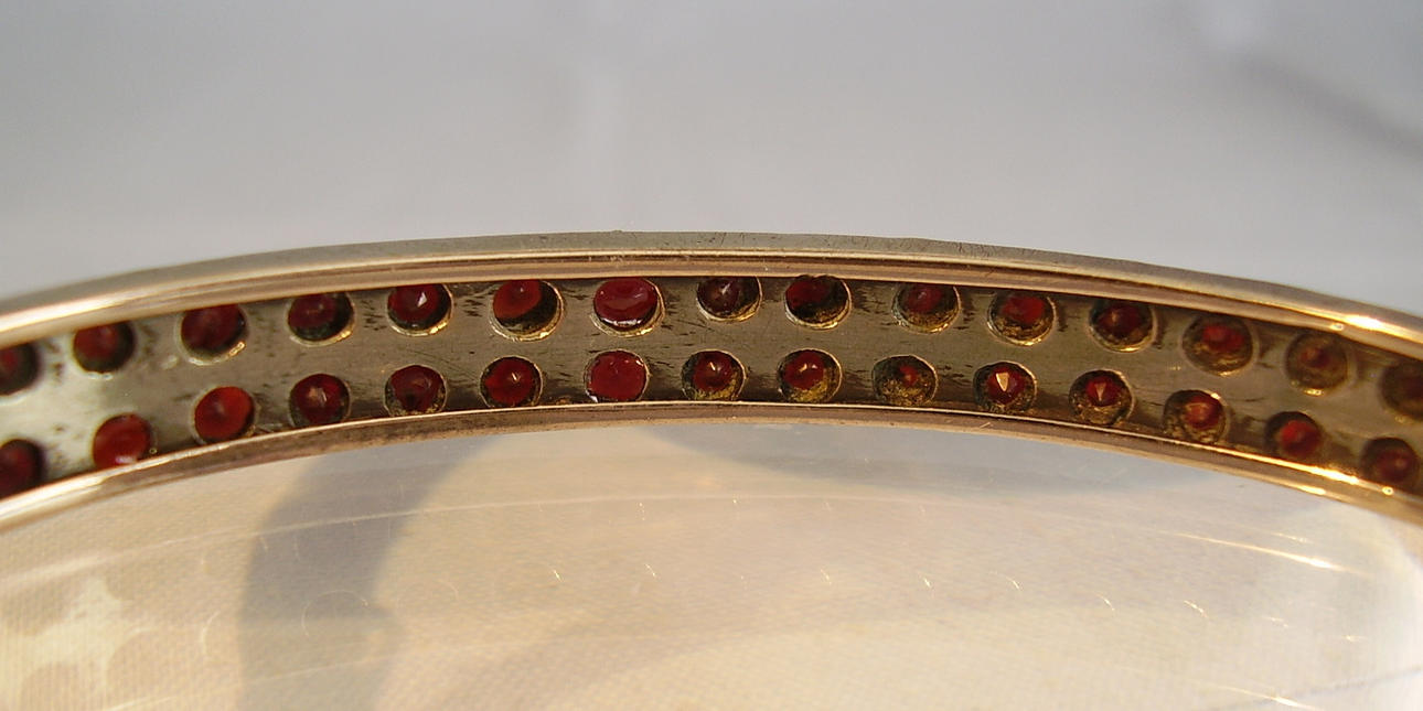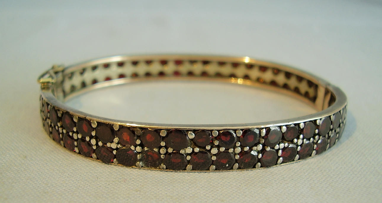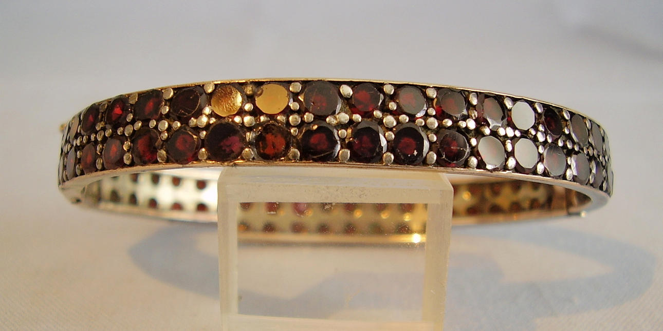 Antiker victorianischer Armreif aus original Tombak /Golddoublé gearbeitet. Er hat eine ovale Form und ist mit Scharnier und Zungensteckschließe mit Sicherheitsacht ausgestattet. Vorder-und Rückseite sind komplett mit rund facettierten blutroten böhmischen Granaten besetzt. Diese sind zu zwei Reihen angeordnet und werden durch randständige Schienen geschützt.