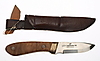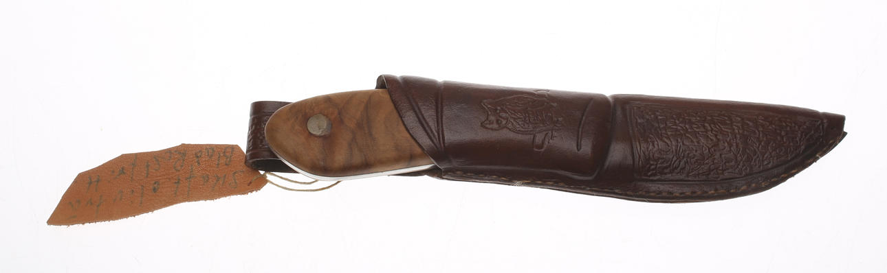 Lederscheide. Griff aus Olivenholz. Klinge aus Edelstahl. Länge ca. 19cm.