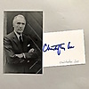 Autogramm mit blauem Filzstift auf weißer Visitenkarte. Christopher Lee war der Cousin von Ian Fleming, dem Autor der James-Bond-Bücher. Er spielte auch den Zauberer Saruman in den Verfilmungen der Ringeni-Trilogie und Der Hobbit – eine seiner letzten Filmrollen. Enthält ein Schwarz-Weiß-Foto in Postkartengröße von ihm.