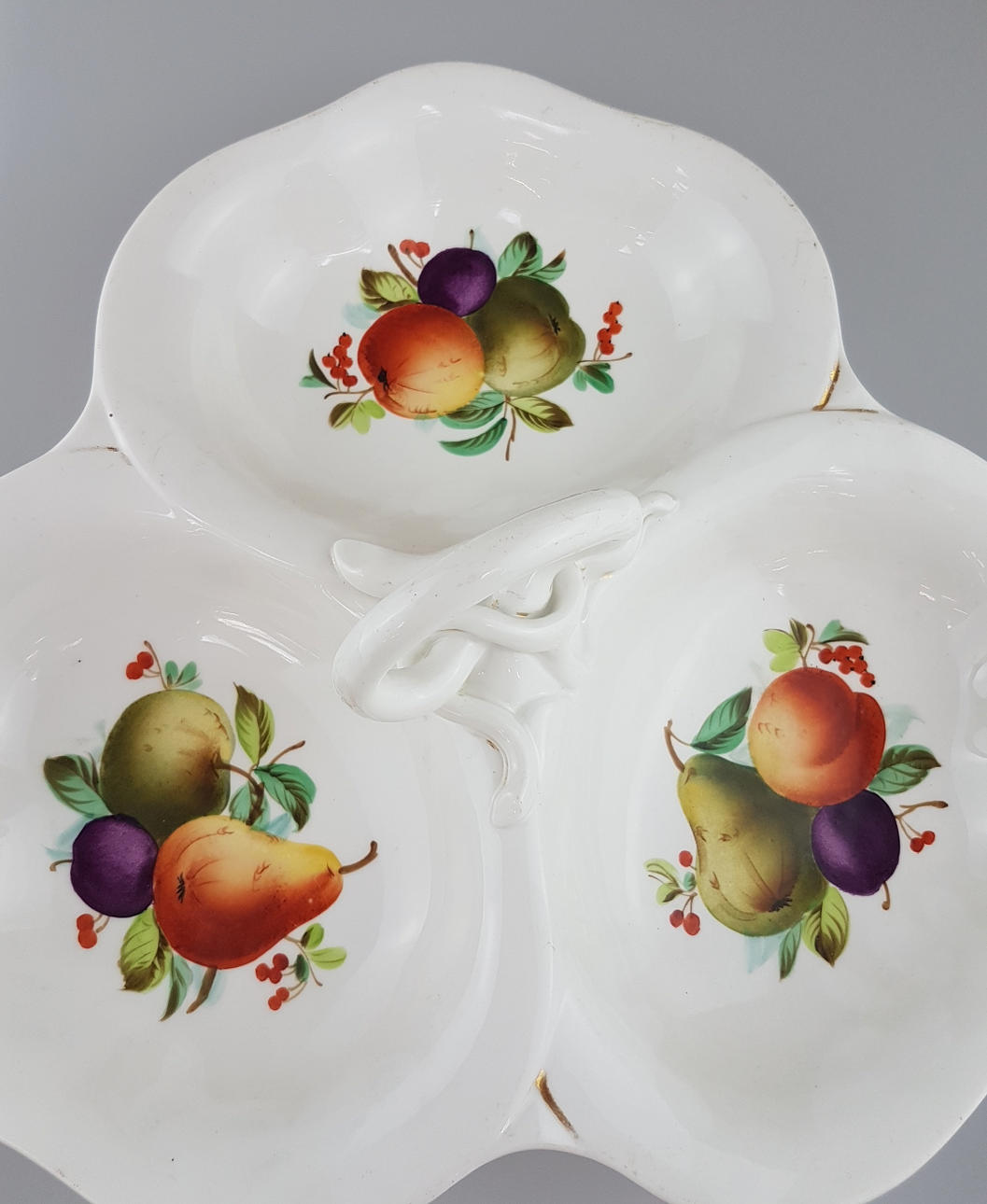 Kabarettschale - gemarkt Carl Tielsch, Kabarettschale mit drei geschwungenen Schalenteilen, polychrom mit Obstdekor bemalt, Reste der Goldstaffage, mit zentralem Ringgriff, D.ca.33cm.