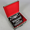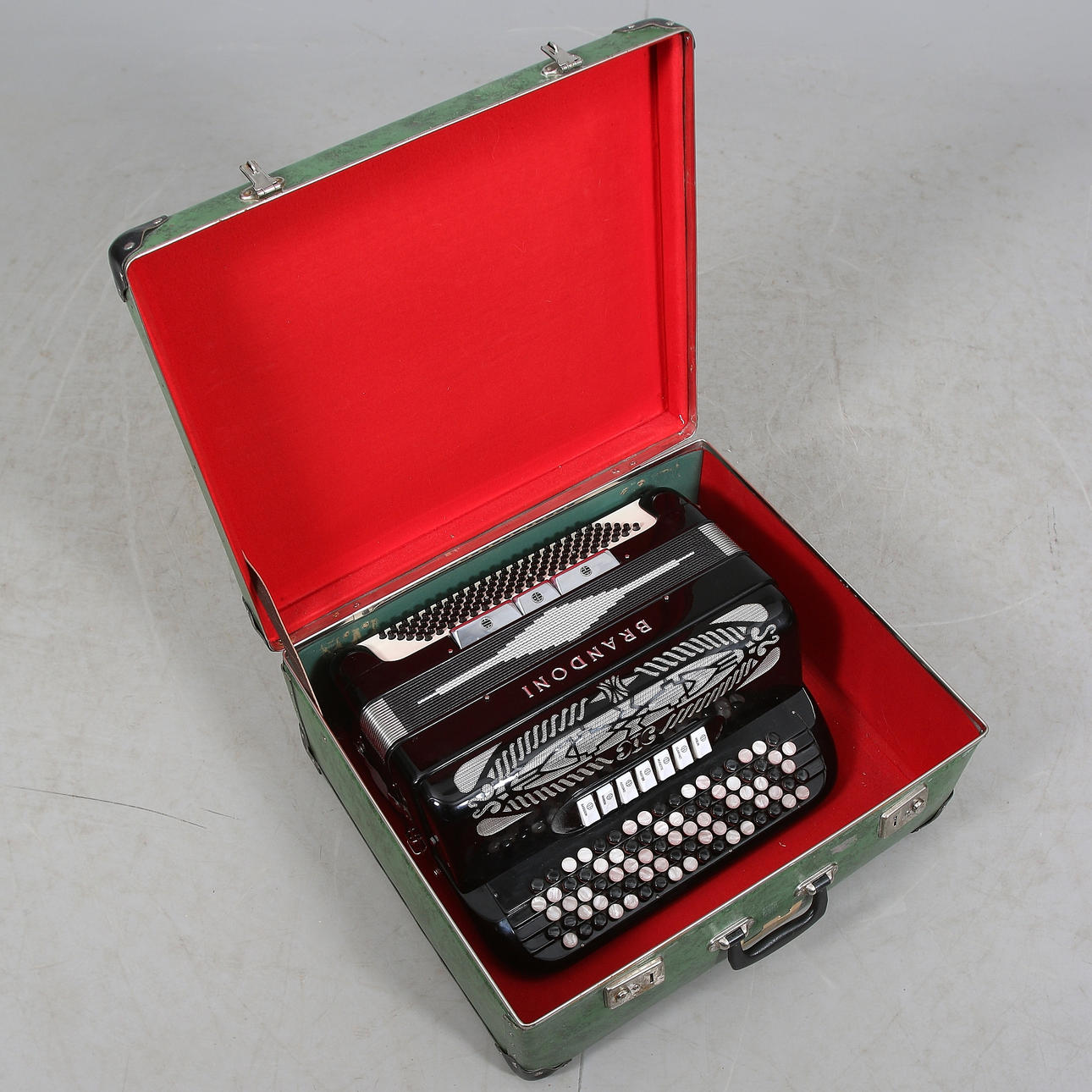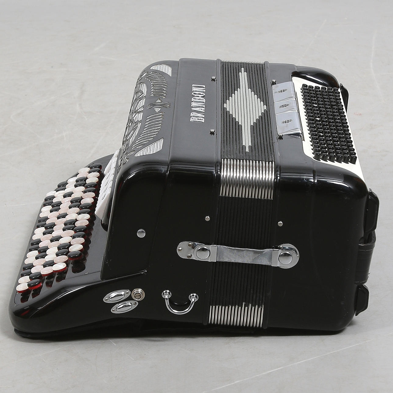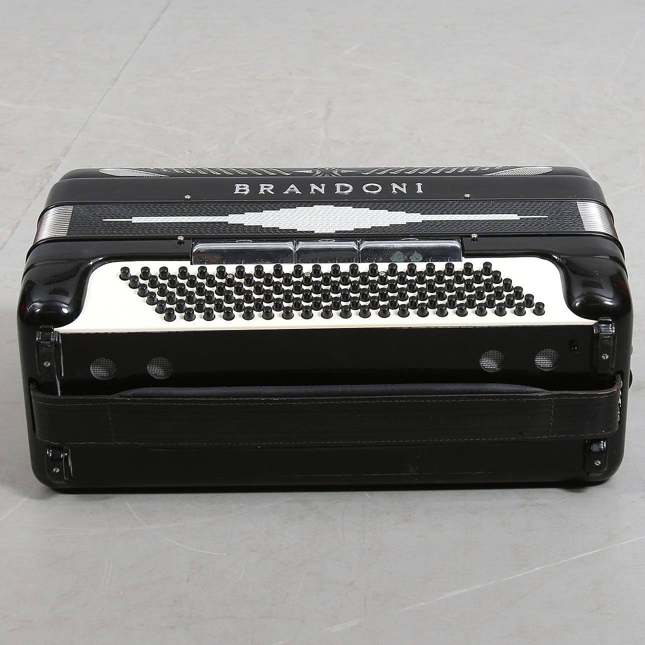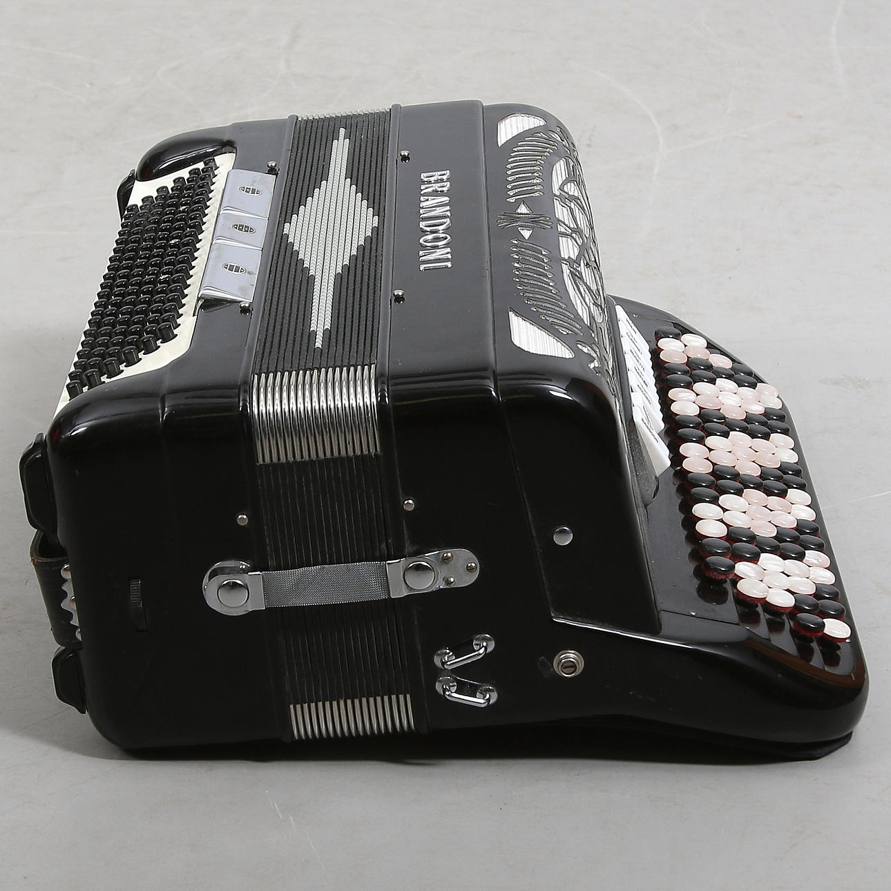 Akkordeon Brandoni 3 Chor mit 7 + 3 Registern. Länge 40, Breite 22, Höhe 51. Gewicht: 9,9 kg Hartschalenkoffer, nicht original, im Lieferumfang enthalten.