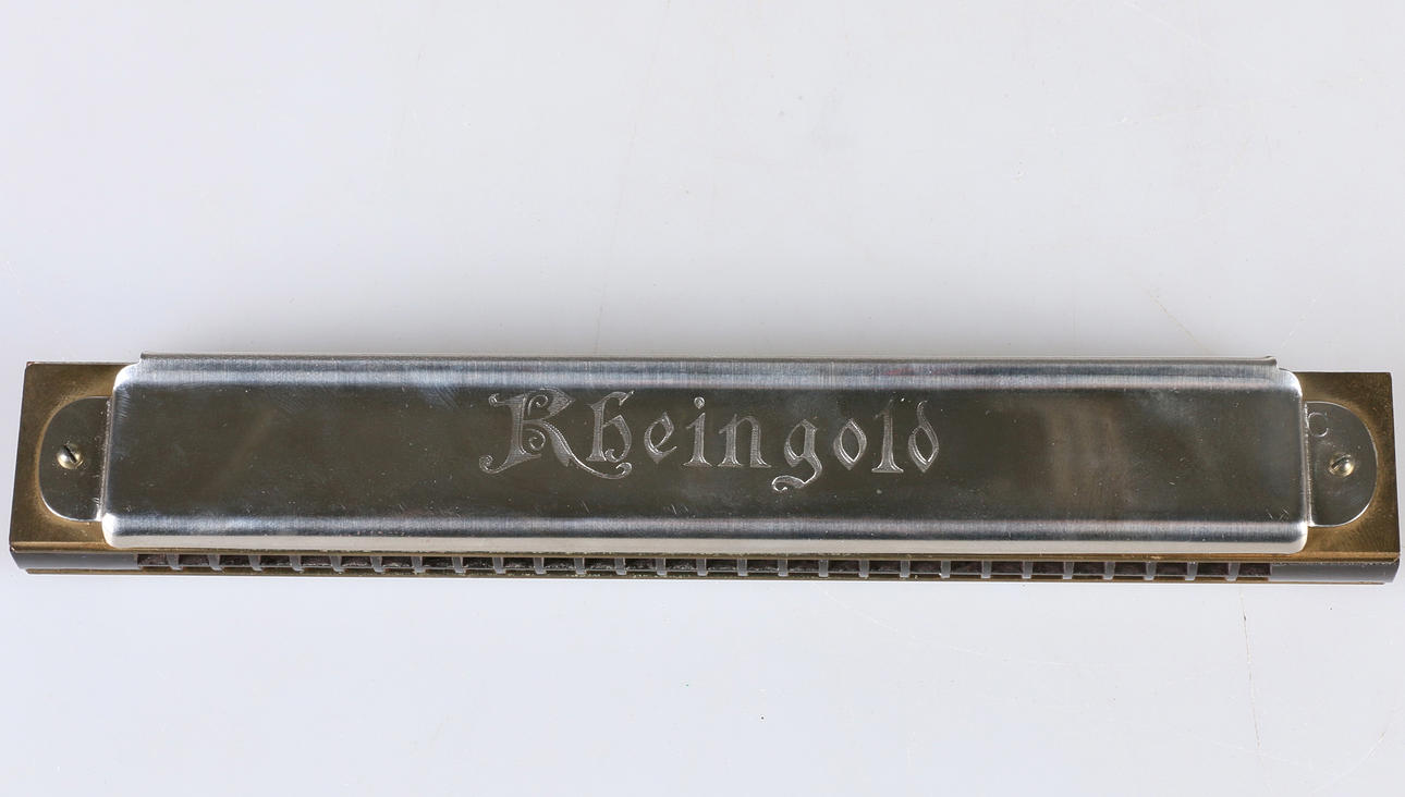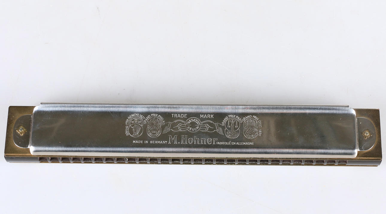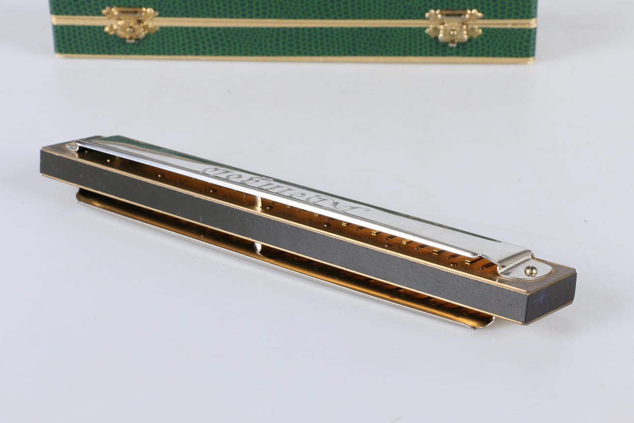 Mundharmonika mit zugehörigem Originalkarton Modellnummer 2475/56 M, C Länge der Mundharmonika 21,5 cm Kartonmaße 23 x 4,5, Höhe 4 cm.