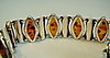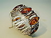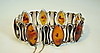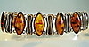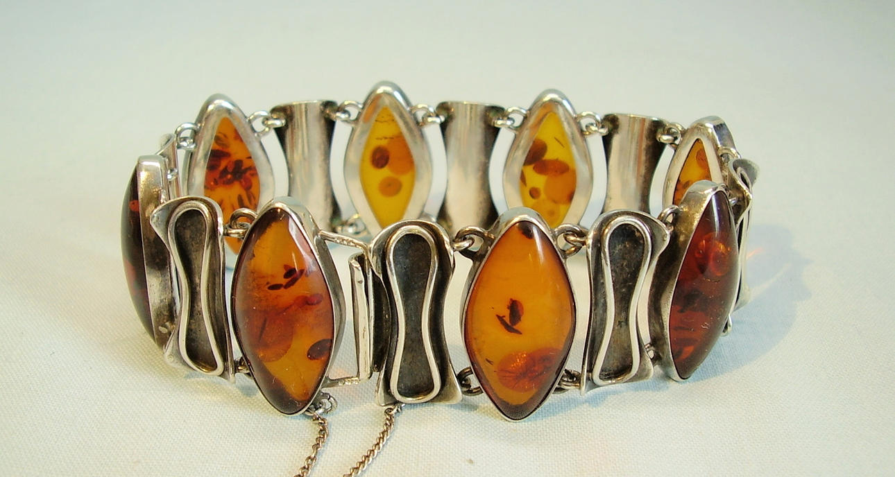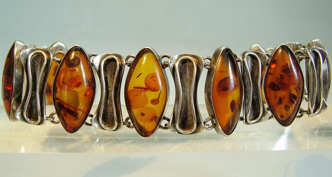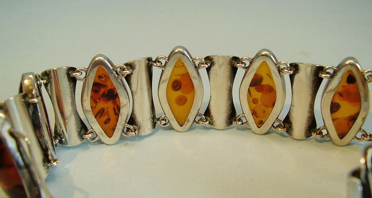 Das Armband ist in Silber 835 gearbeitet und auch so am Verschluss punziert. Es besteht aus 8 großen gerundeten rautenförmigen Bernsteinen in schöner Honigfarbe mit verschiedenen Einschlüssen in glatten Fassungen. Diese sind im Wechsel mit Silberteilen mit Aufschmelzungen verziert.Das Armband wird durch einen Einhänge-Verschluss mit Sicherheitskettchen geschlossen und geöffnet.