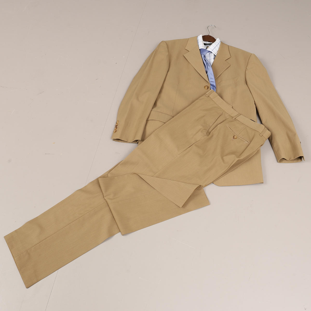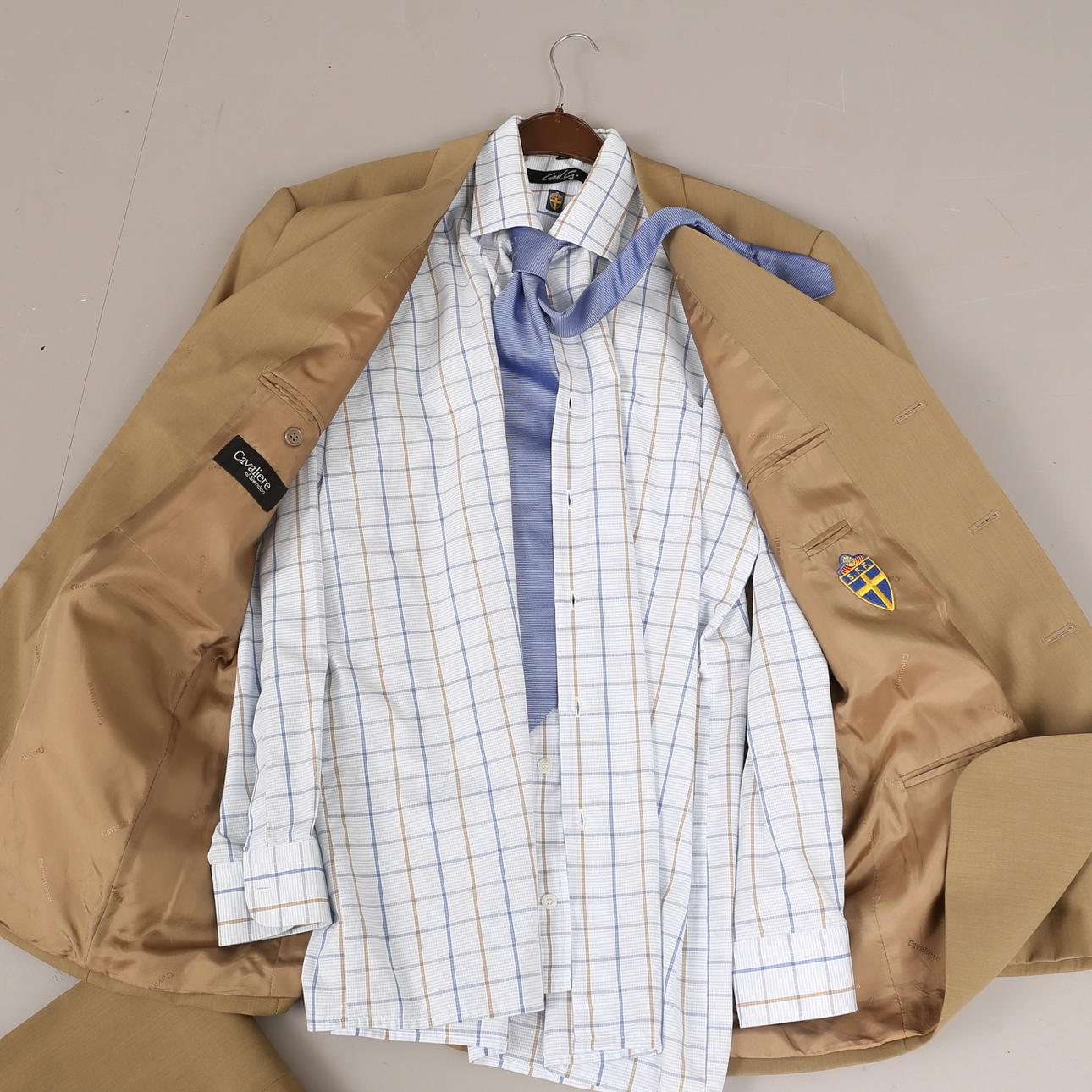 Anzug für die schwedische Fußballnationalmannschaft für die WM 90 in Italien, Blazer und Hose der Marke Cavaliere in Größe 52. Hemd der Marke Carl G.