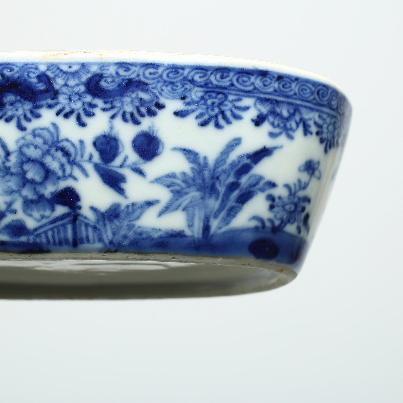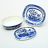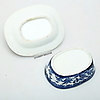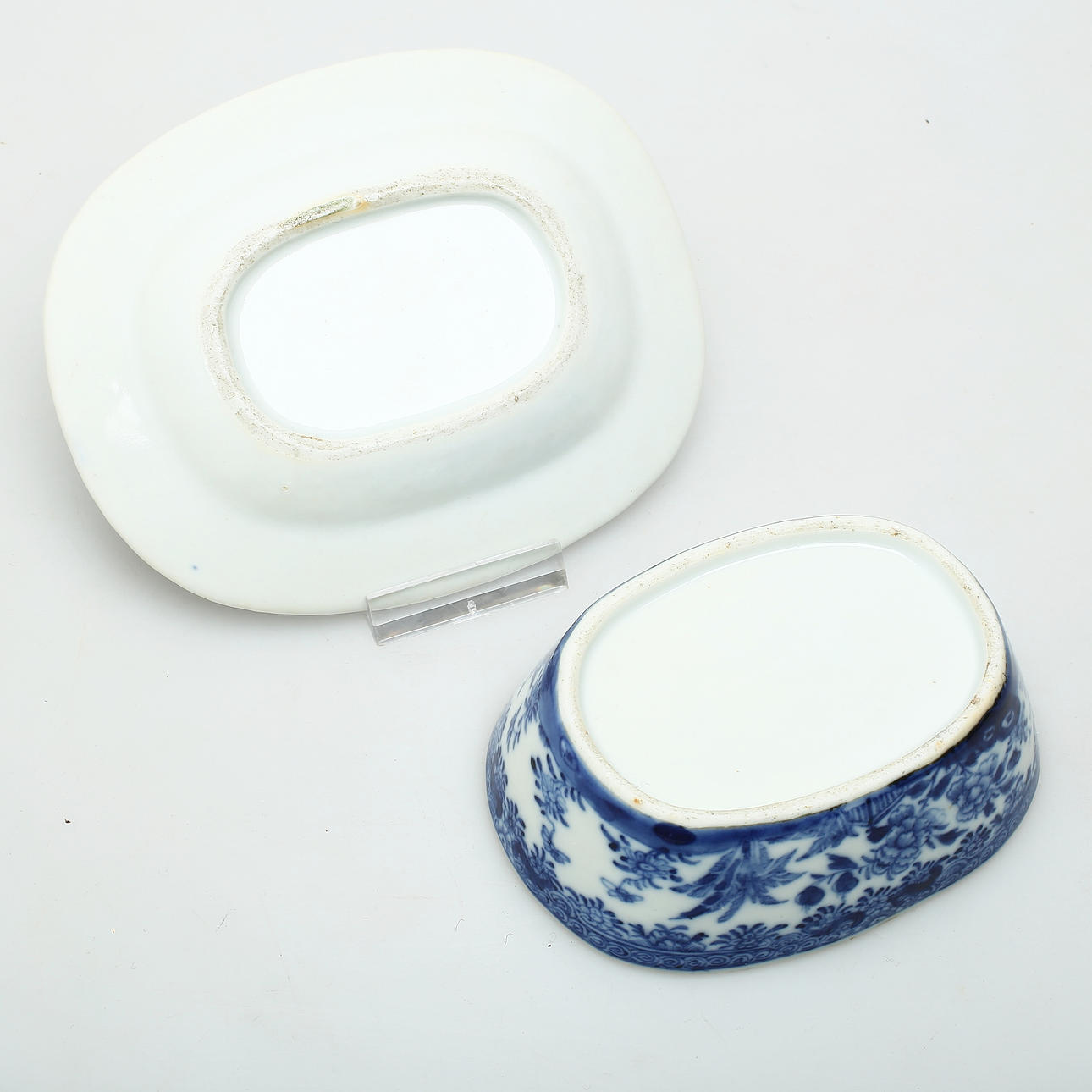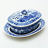 Unterglasurblau, Länge der Schale 13,5 cm, Länge des Deckels 11 cm.
