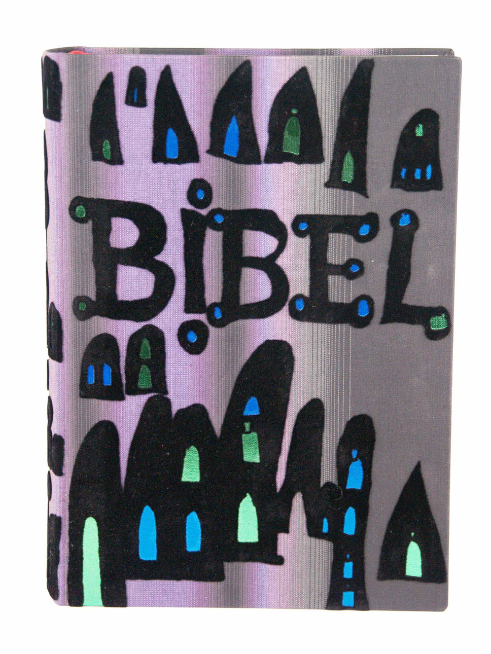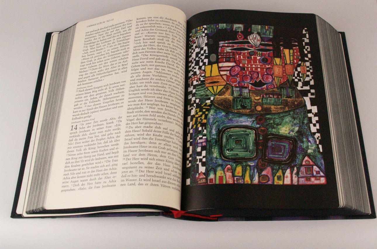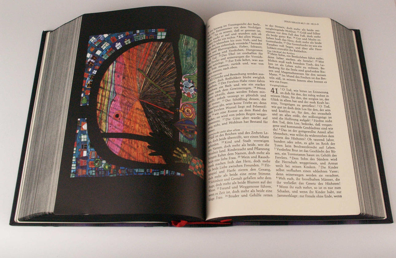 Hundertwasser,Friedensreich (1928 Wien - 2000) - Die Bibel - Die heilige Schrift des Alten und Neuen Testamentes, in der Übersetzung von V.Hamp, Pattloch Verlag, Augsburg, 1995, ca.30 x 22x8cm, Leinenband mit Samtappliken,jedes Exemplar dieser Ausgabe weist eine andere Farbkombination in der Leinenwebung sowie Unterschiede in den farbigen Einlegearbeiten auf,im Originalschuber, Topzustand.
