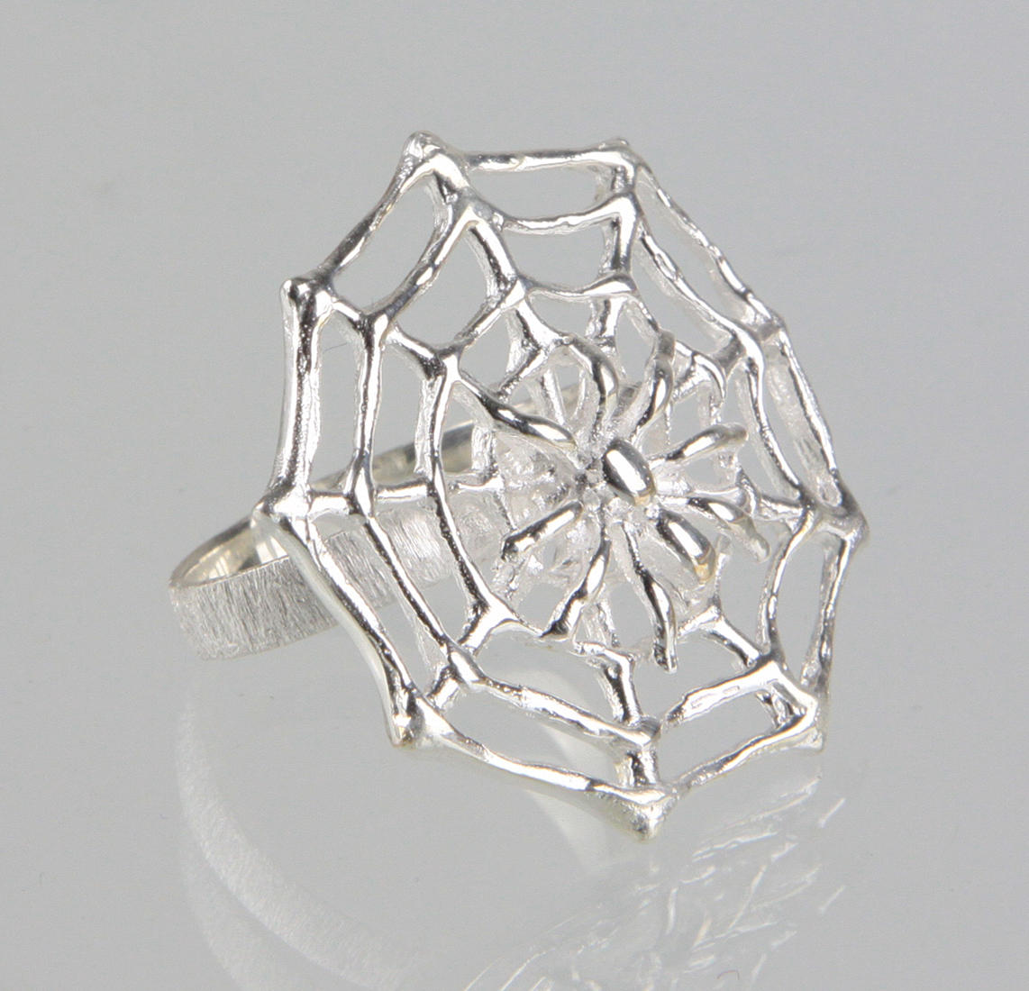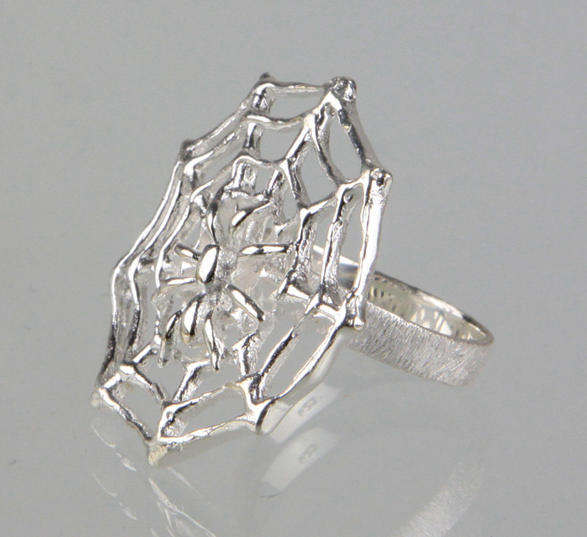 Ring aus Silber 925 so auch punziert, Ringkopf in Form eines Spinnennetz mit Spinne, Ringgröße 54, Ringkopf 27 mm, Gewicht 6 Gramm.