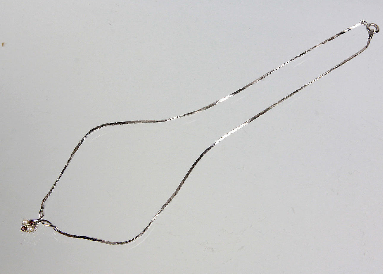 Granat - Perl - Collier 925 Silber, Kobrakette mit Mittelteil dieses mit 2 Akoyaperlen und 2 facettierte Granate besetzt, Gewicht ca. 4,8 Gramm, Länge 43 cm.