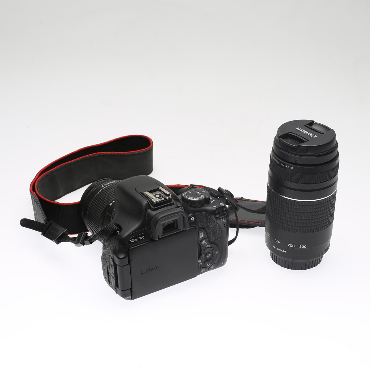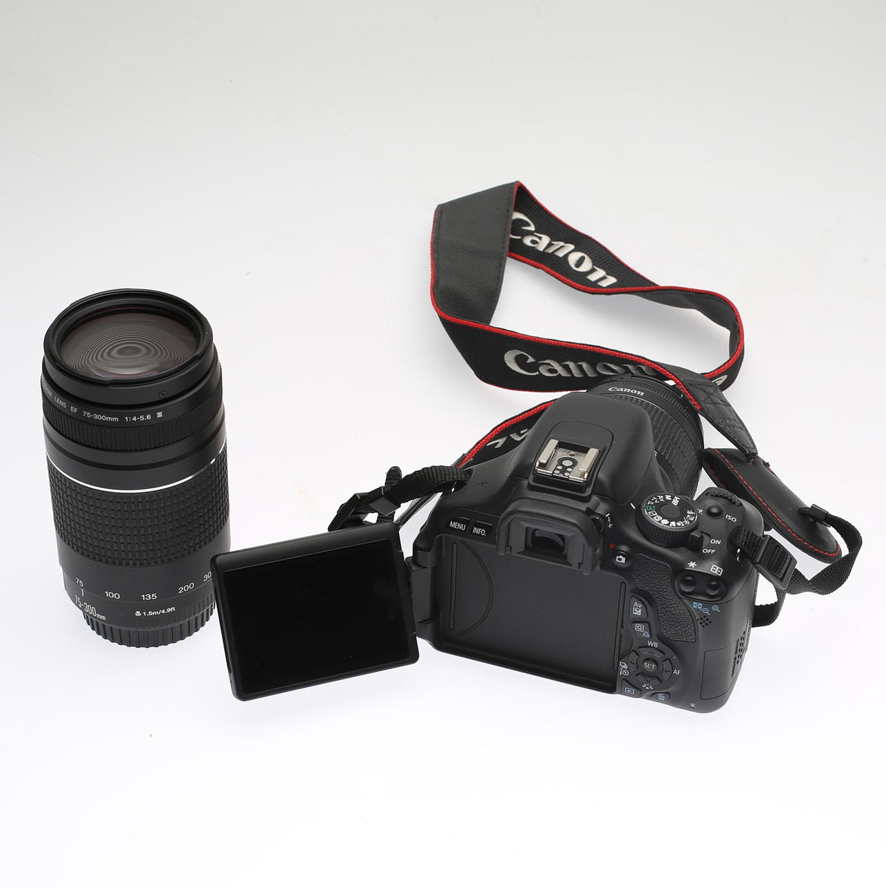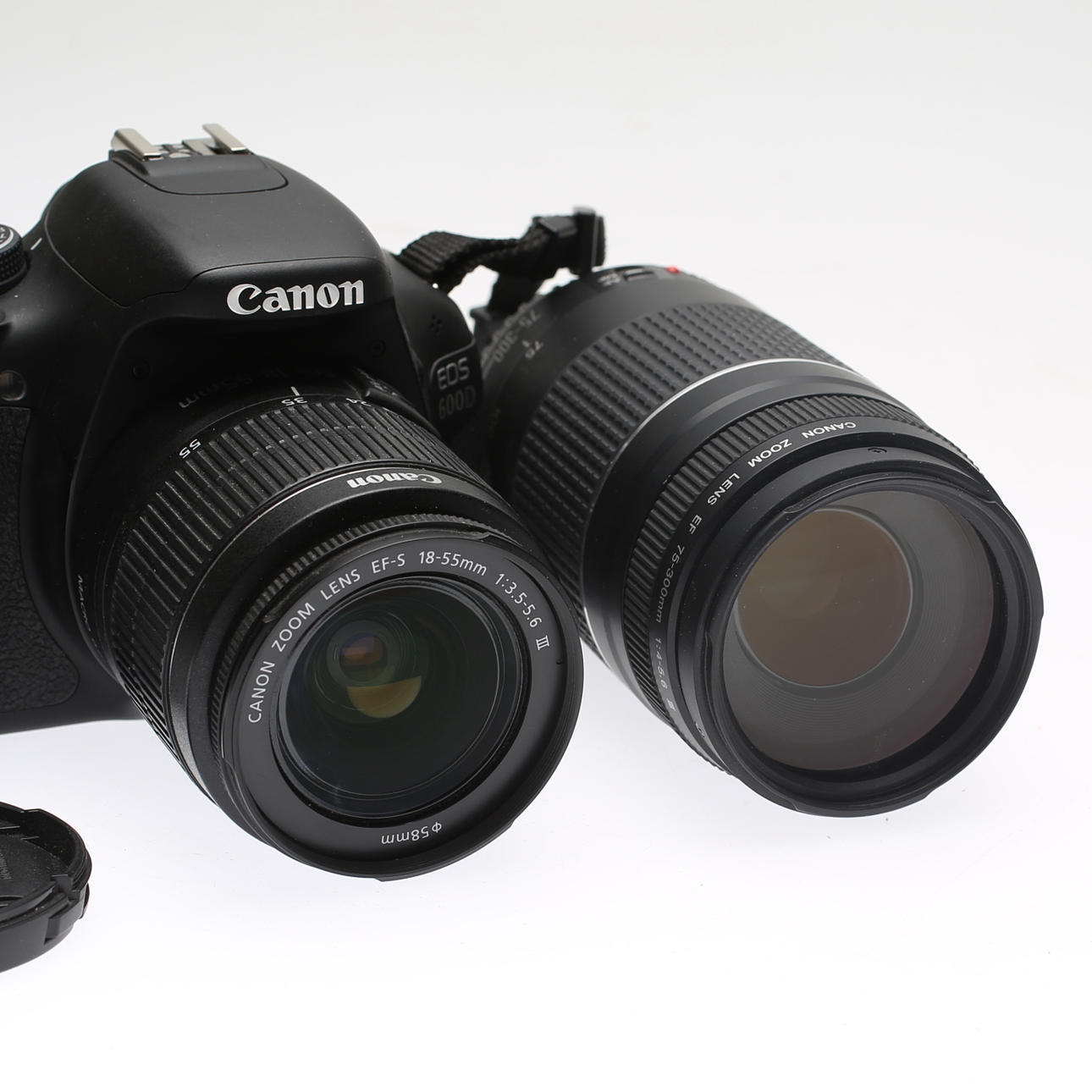 Objektiv Canon Zoomobjektiv EF-S 18-55 mm Makro 0,25 m/0,8 ft, ⌀ 58 mm. Objektiv Canon Zoomobjektiv EF 75-300mm 1:4-5.6 III, ⌀58mm. Inklusive Ladegerät, Akku, Kabel, Speicherkarte und Bedienungsanleitung.