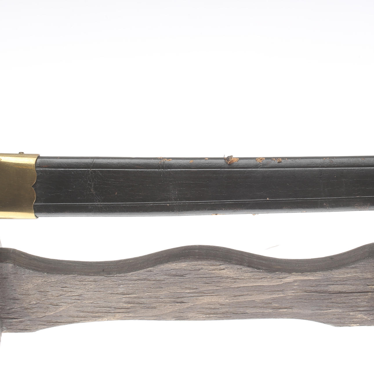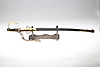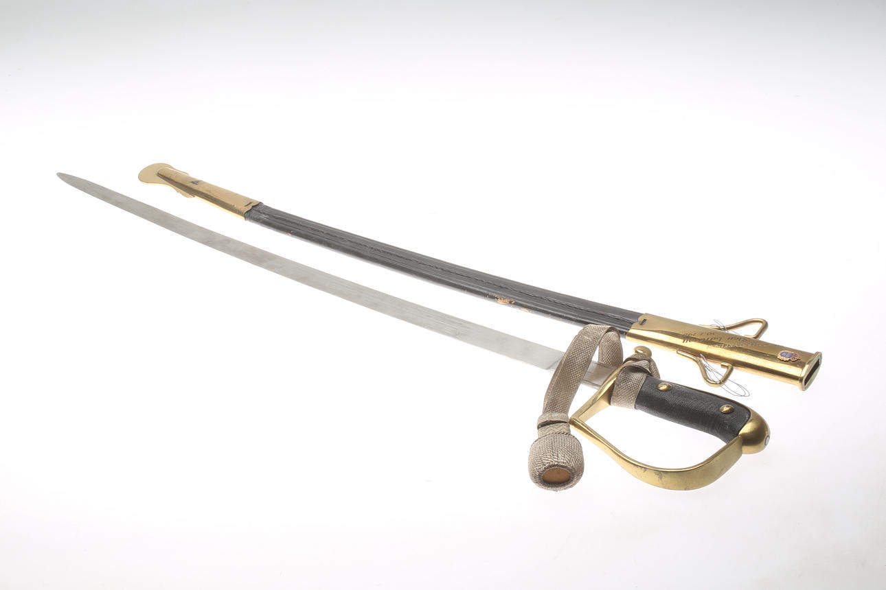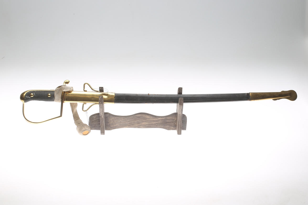 Messingbügel, Scheide aus Leder und Messing, Länge ca. 77, Klinge 64 cm.