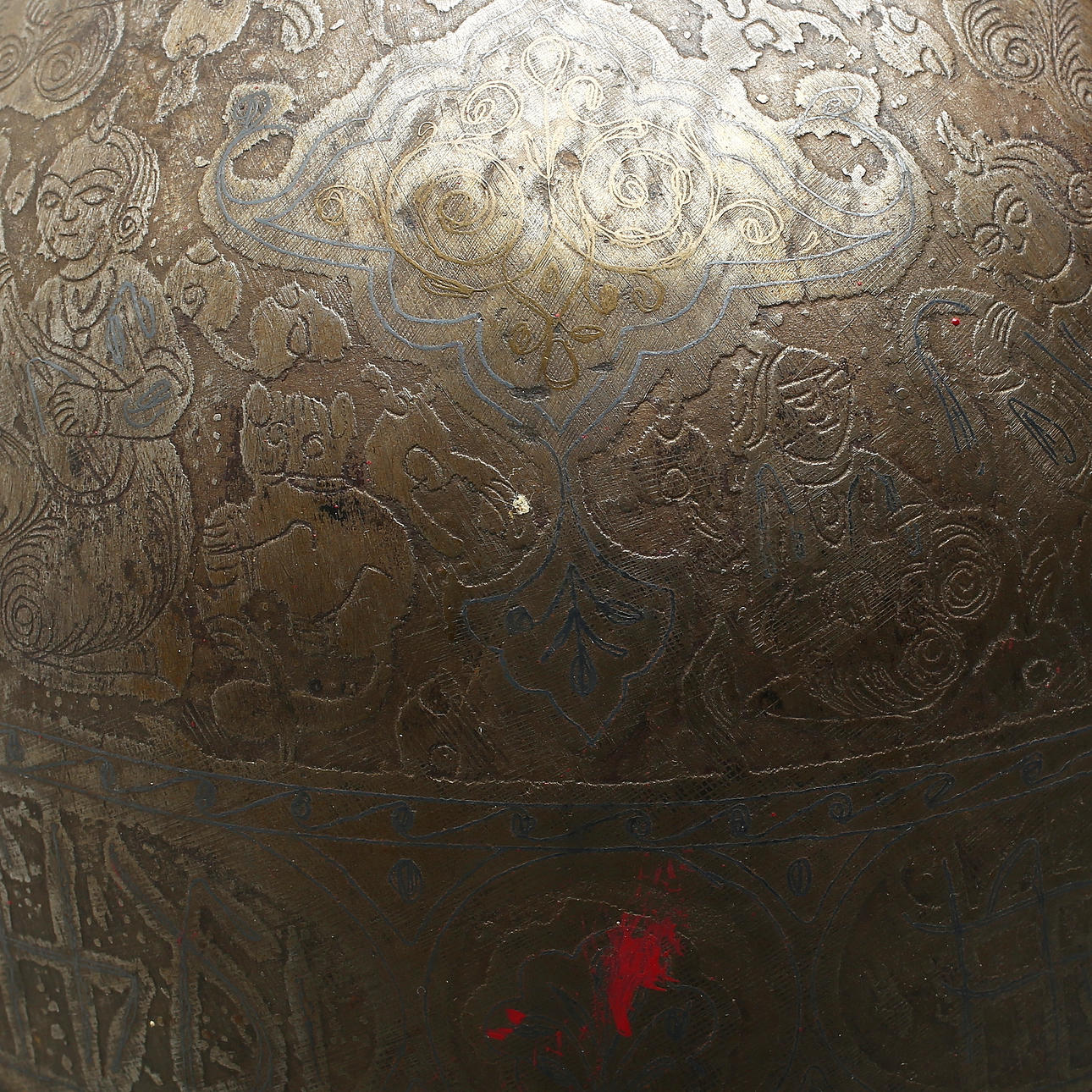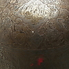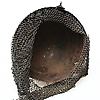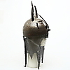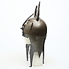 Geätzte Dekoration von Pflanzen und Figuren. Geformt wie ein Gesicht und mit zwei Hörnern. Durchmesser ca. 21,5 cm, Höhe ca. 30 cm ohne Kettenhemd.