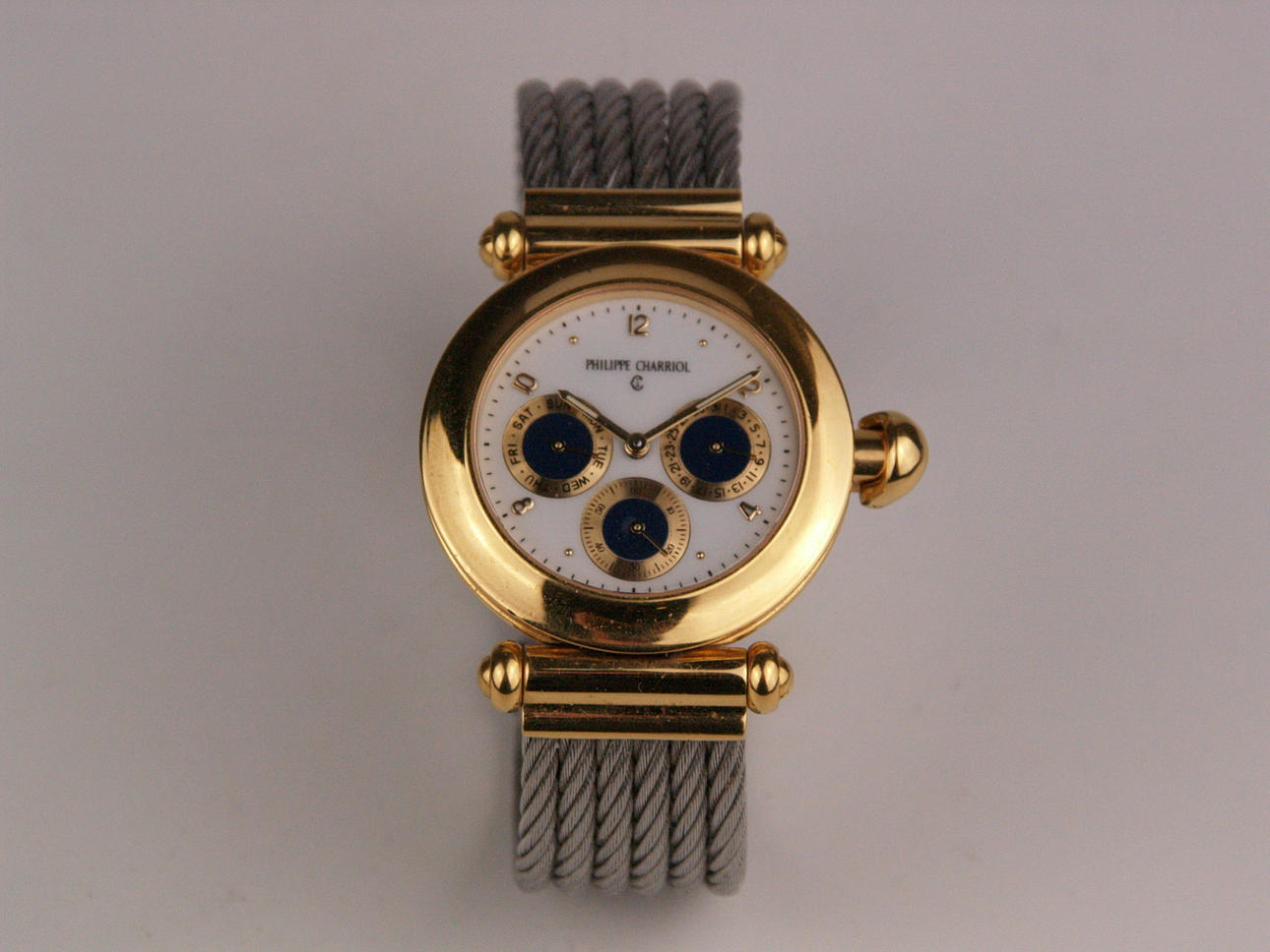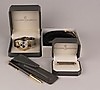 Herren-Set - Philippe Charriol The Celtic Collection,4-tlg: Herrenarmbanduhr - weißes Zifferblatt mit diversen Anzeigen, arabischen Zahlen, Strichindizes und zentraler Sekunde, verso runde Plakette mit Kolumbus-Porträt sowie Umschrift "Christopher Columbus 1492 America 1992", Nr.37902406, Stahlgehäuse mit 18kt-Vergoldung, Quartz Uhrwerk,Dm.ca.35mm,in Orig.Schatulle/Kugelschreiber,L.ca.14cm,im Orig.Etui/ Krawattennadel,L.ca.5,5cm,in Orig.Schatulle/Gürtel mit entsprechend gearbeiteter Schnalle, L.ca.125cm,Breite ca.3cm,in OV, alle gemarkt, neuwertig,anbei Orig.Etuis mit div.Dokumenten und Booklets.