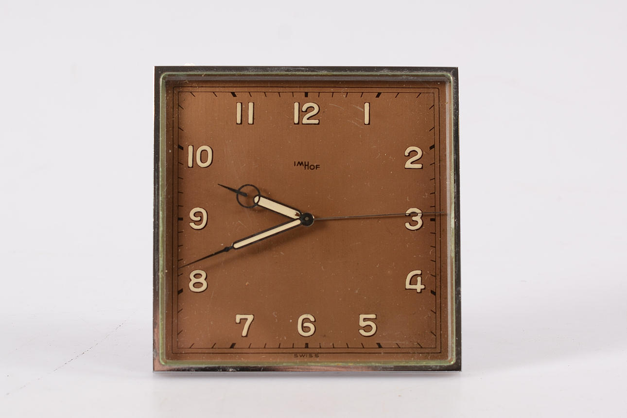 IMHOF, Wecker, 100 x 100 x 25 mm, Gehäuse-Nr. 658660, Weißmetall, mechanisch, 8-Tage-Werk.