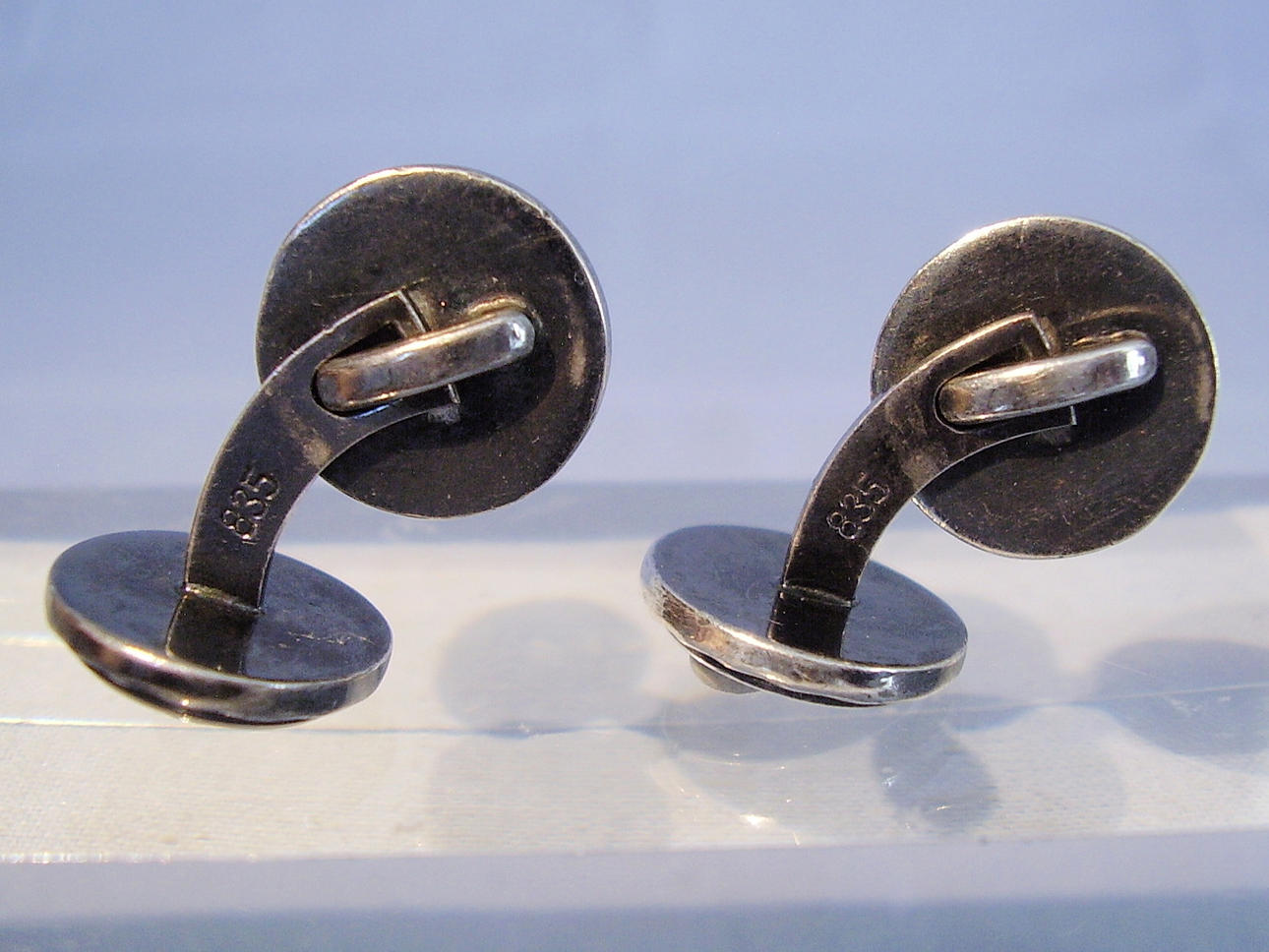 Die Manschettenknöpfe sind in Silber 835 gearbeitet und auch so am festen Steg auf der Rückseite punziert.