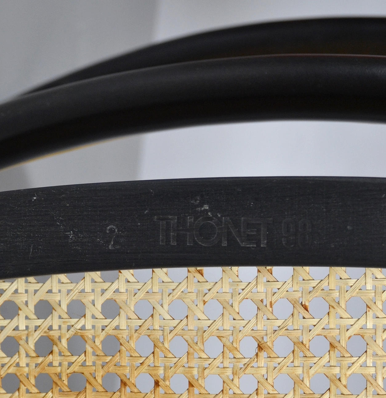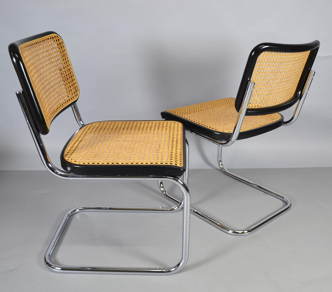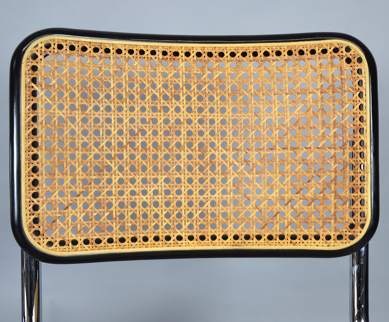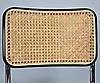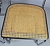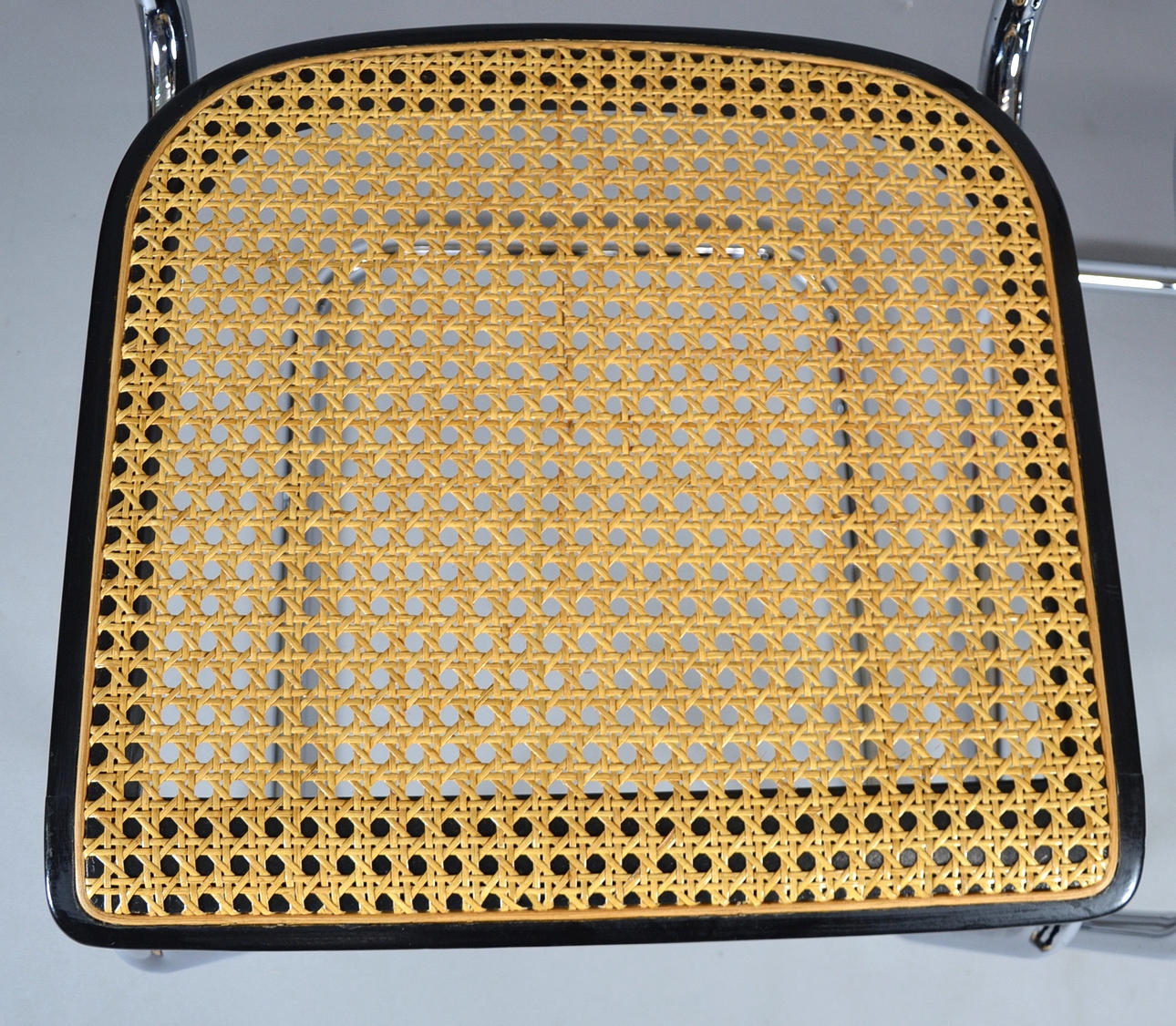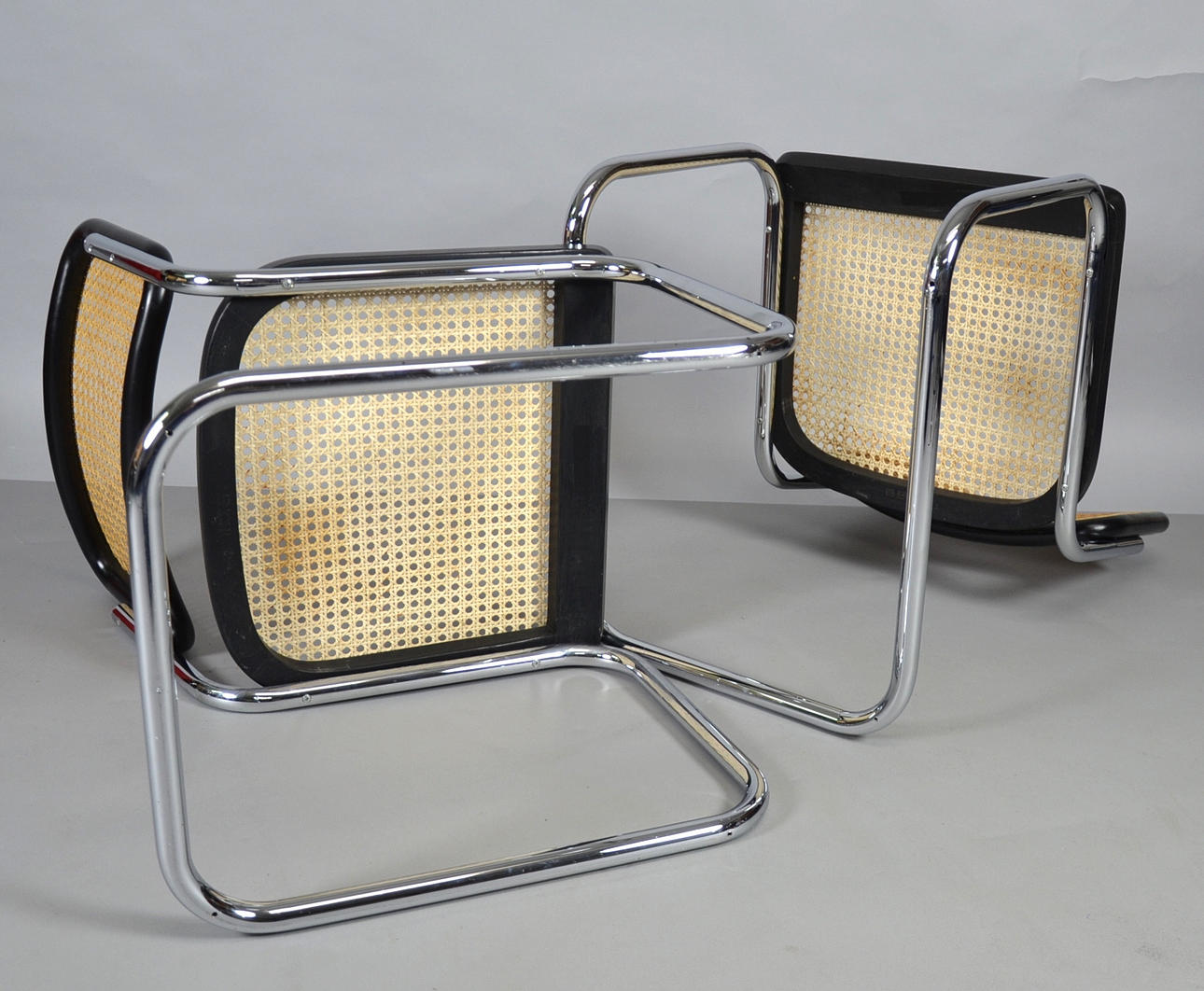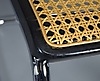 Gestell Stahl verchromt, Sitz in Buchenholz schwarz lackiert mit Rohrgeflecht.