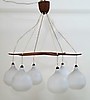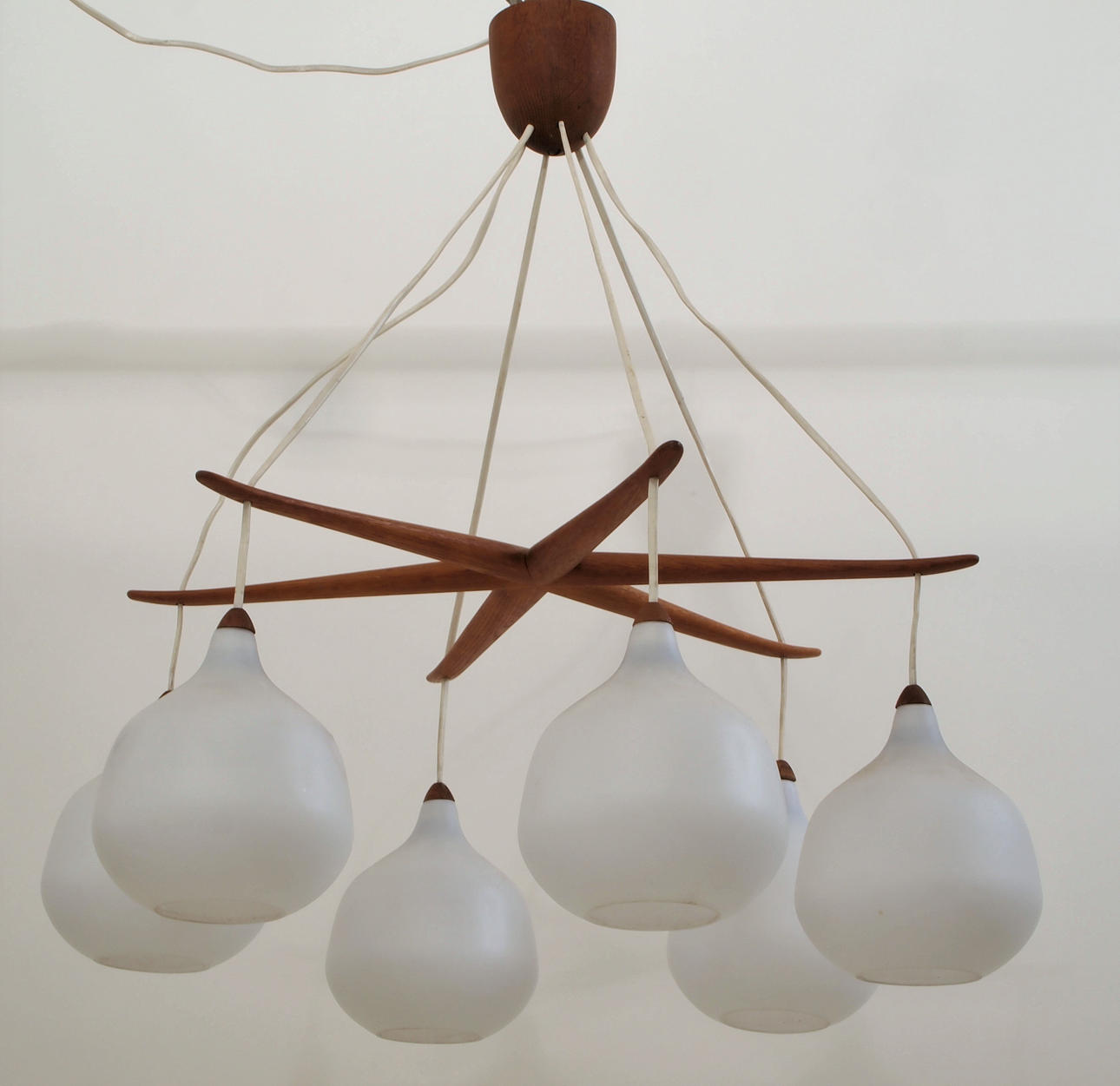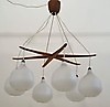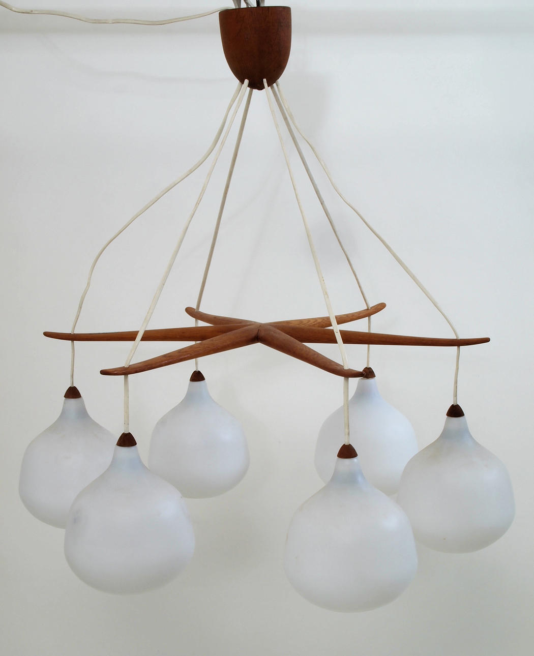 Kreuzförmiger Rahmen in Eiche. Sechs runde weiße Glasbecher Durchmesser 60 cm Nicht funktionsgeprüft.