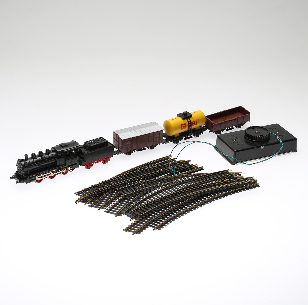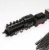 Set mit Lokomotive, Waggons und Schienen. Im Originalkarton.