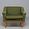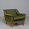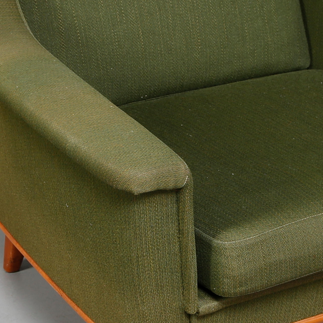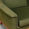 Gestell in Teakholz, Sitz- und Rückenpolster stoffbezogen. Sitzhöhe 41 cm, Höhe 66 cm, Tiefe 85 cm, Breite 83 cm.