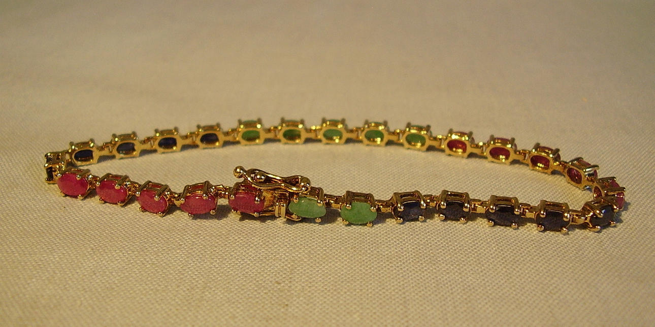 Das Armband ist als Riviere-Armband ausgeführt und mit 10 oval facettierten, natürlichen Rubinen, 10 natürlichen, blauen Saphiren und 7 natürlichen Smaragden besetzt.