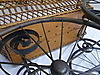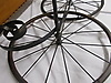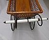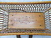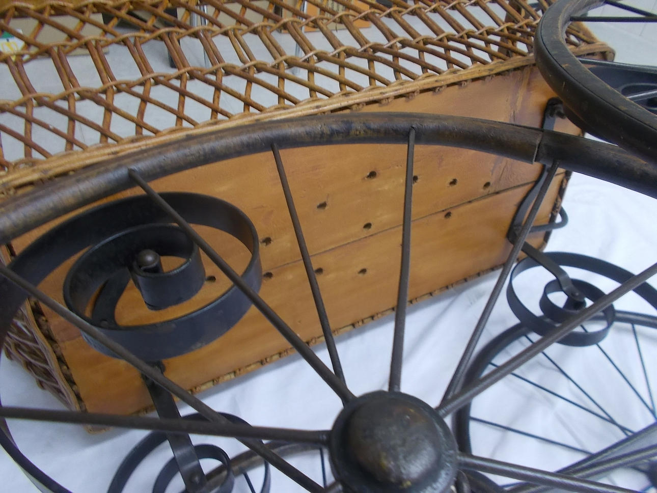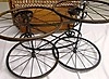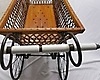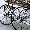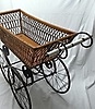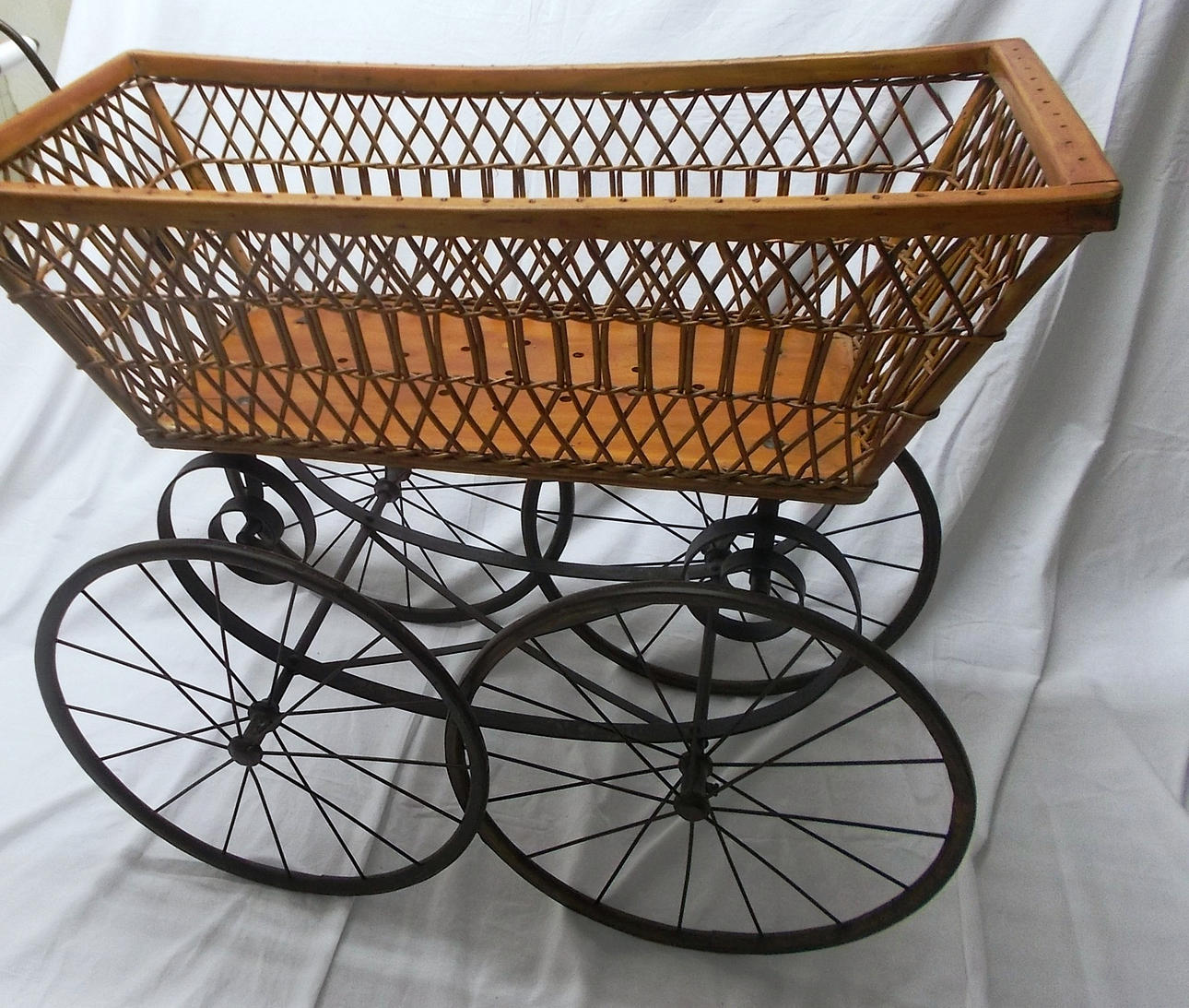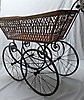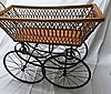 Antiker Kinderwagen mit aufwendigem Eisengestell, Eisenräder, geflochtenes Holz und Porzellangriff, Masse etwa 84 cm hoch, 40 cm breit, etwa 90 cm lang und bis zum Griff 100 cm lang, der Boden des Kinderwagens hat vorgestanzte Löcher zur Befestigung von Polsterung, um 1900, museal.