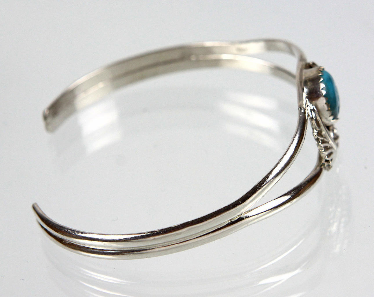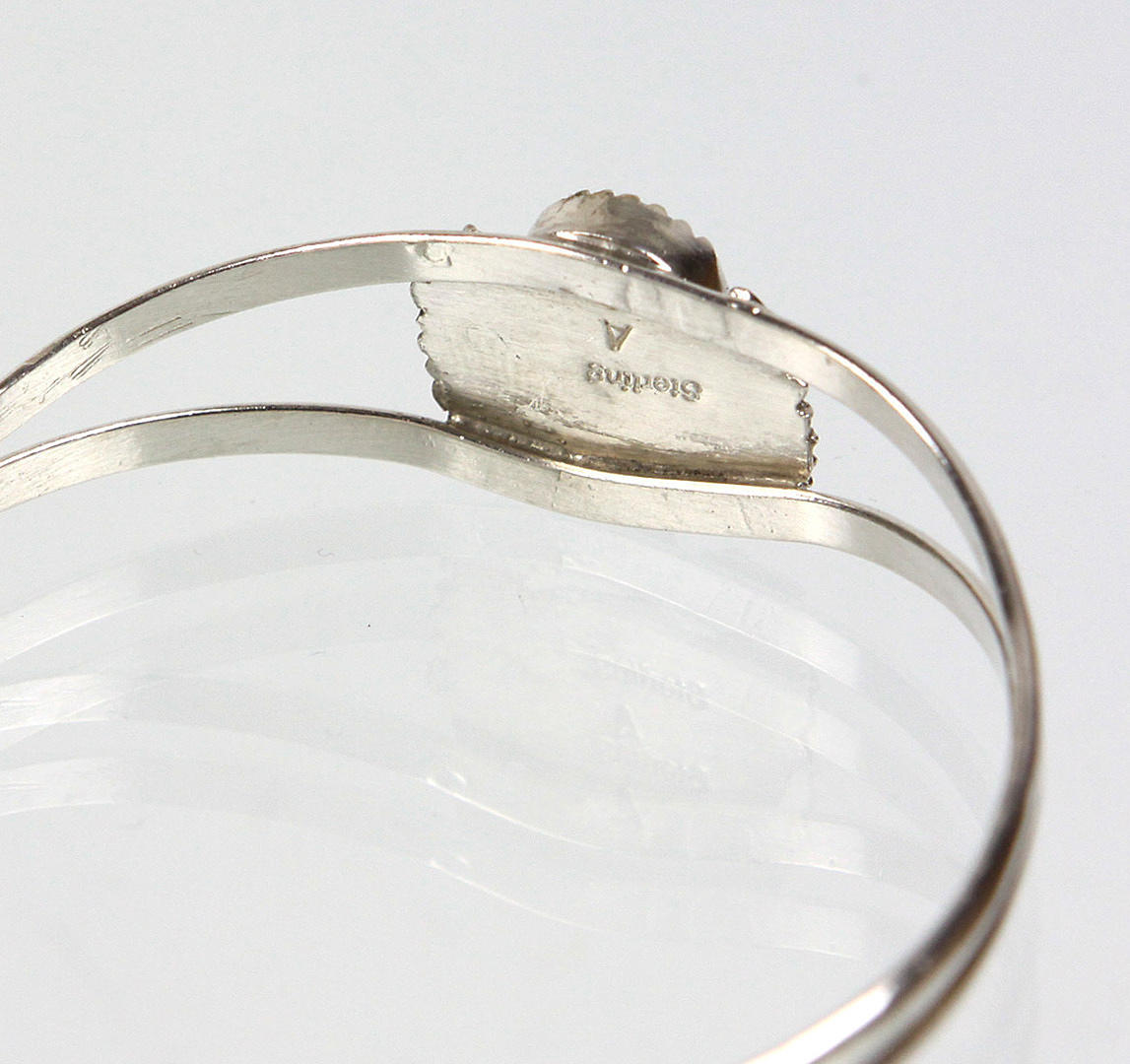 Armspange Sterling punziert für Silber 925, unten offen gearbeitet, mittig mit einem Türkis besetzt, Durchmesser 5,4 mm, Breite in der Mitte 15 mm, Gewicht 9,7 Gramm.