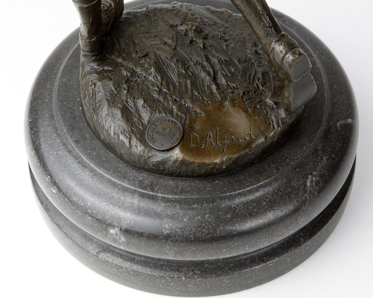 große Bronzefigur elegante Golfspielerin, auf runden Marmorsockel, Gesamthöhe ohne Schläger 40 cm.
