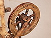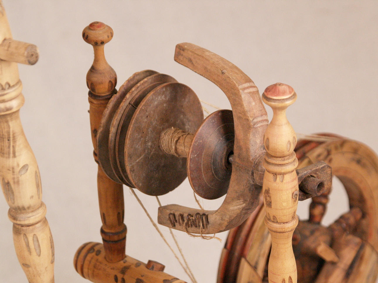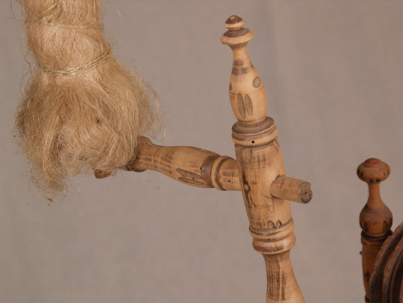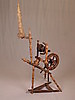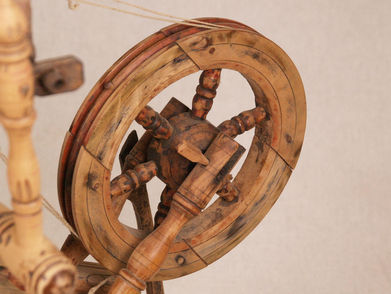Spinnrad - Holzgestell aus gedrechselten Balusterstäben, mit Rocken,ca.113x78cm.