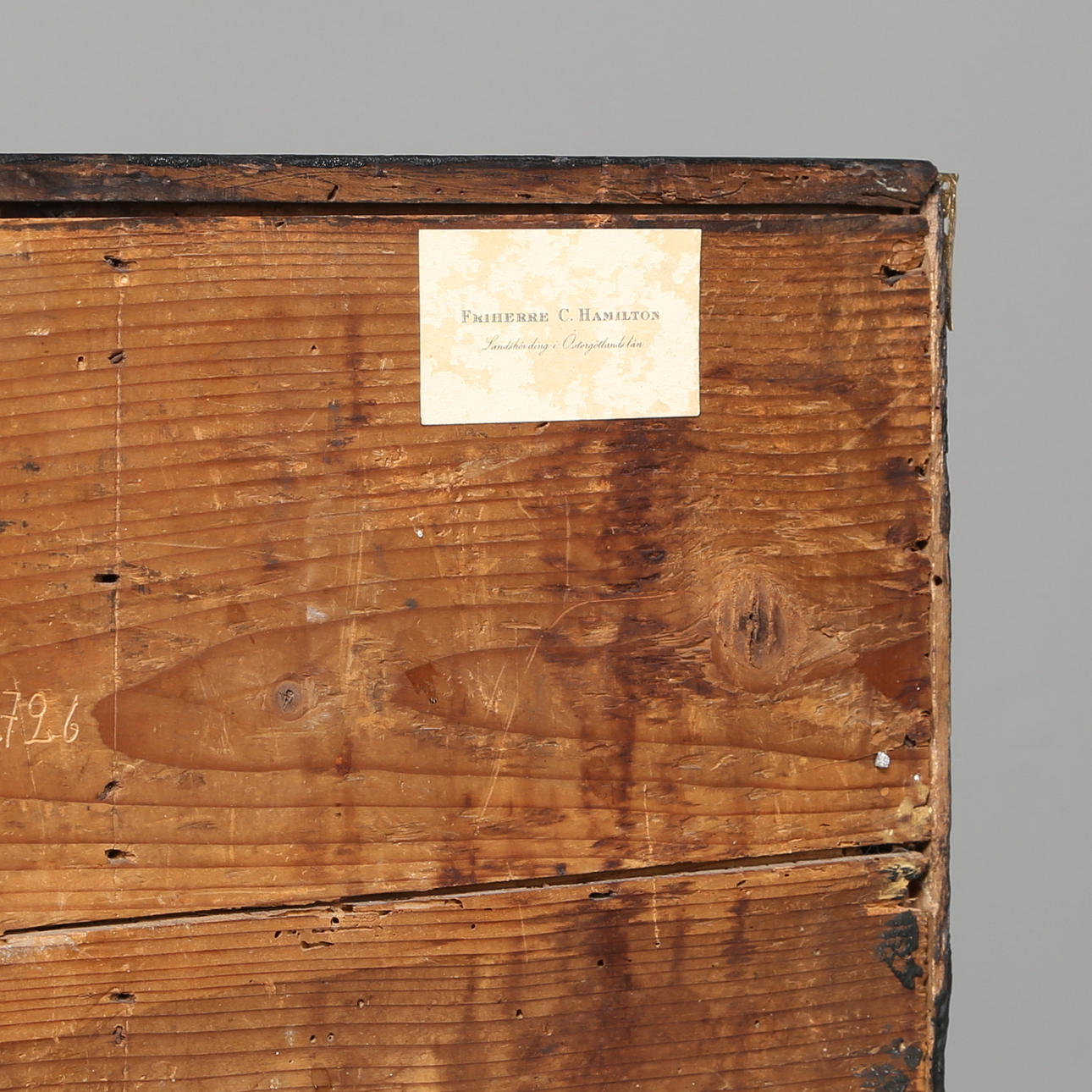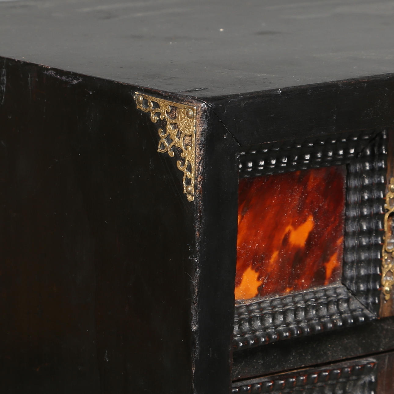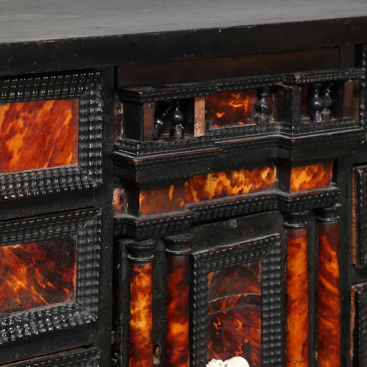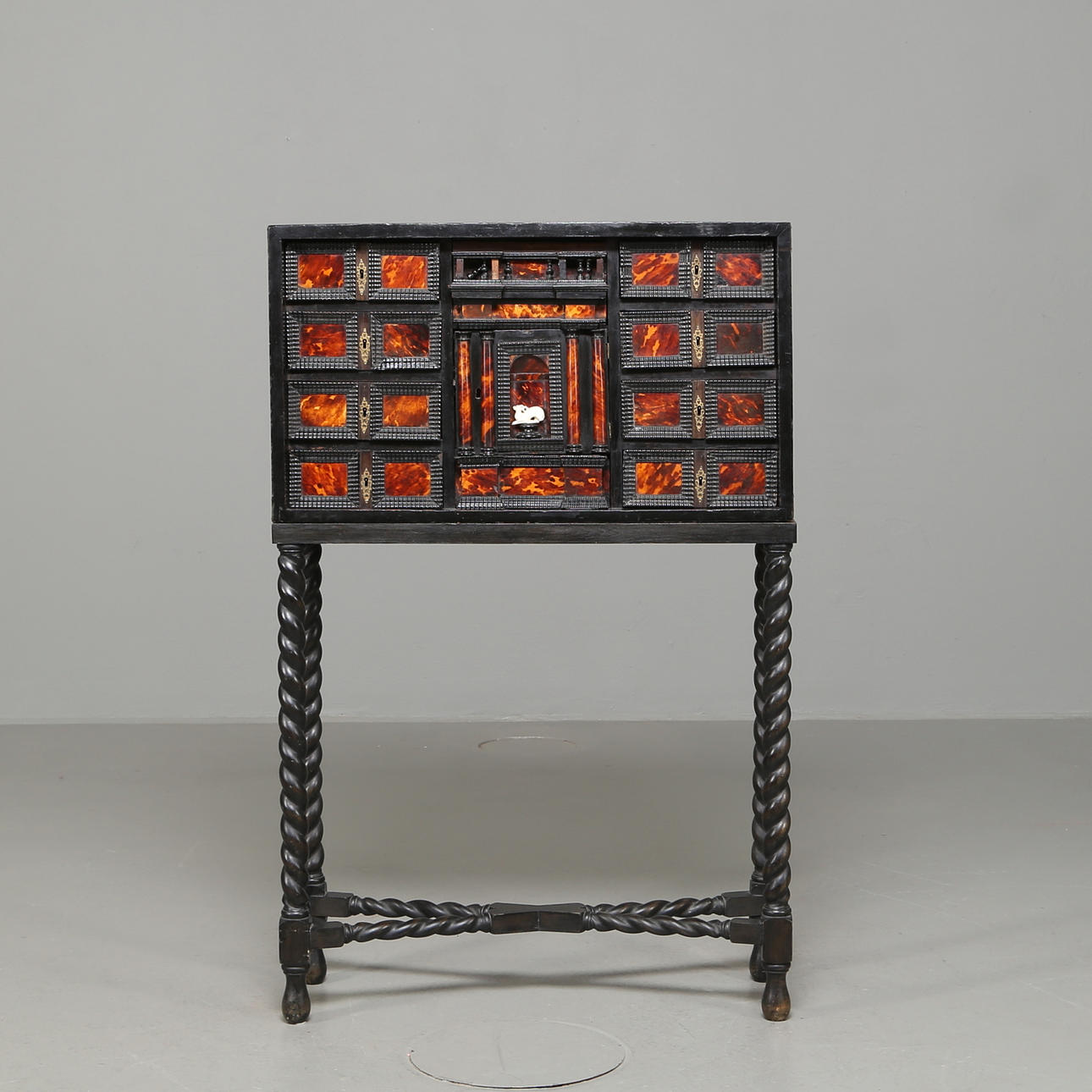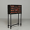 Kabinettschrank barock, 18. Jahrhundert, wohl Holland, mit 10 Schubladen mit Schildpatt und Tür mit Schildpatt und Hirsch in wohl Elchknochen, furniert mit geschwärztem Holz Höhe 118,5 cm, Breite 76 cm, Tiefe 25,5 cm Provenienz Friherre Carl Hamilton.