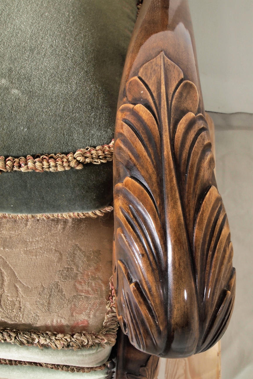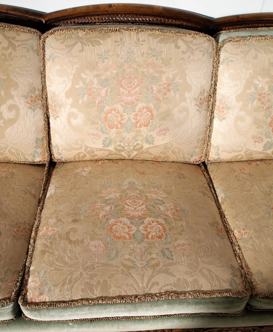 Rahmen in gutem Zustand, abgesehen von einem kleinen Loch im Rattan auf der Rückseite. Stoff verblasst, Gebrauchsspuren und Flecken.