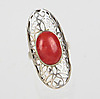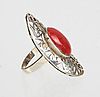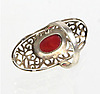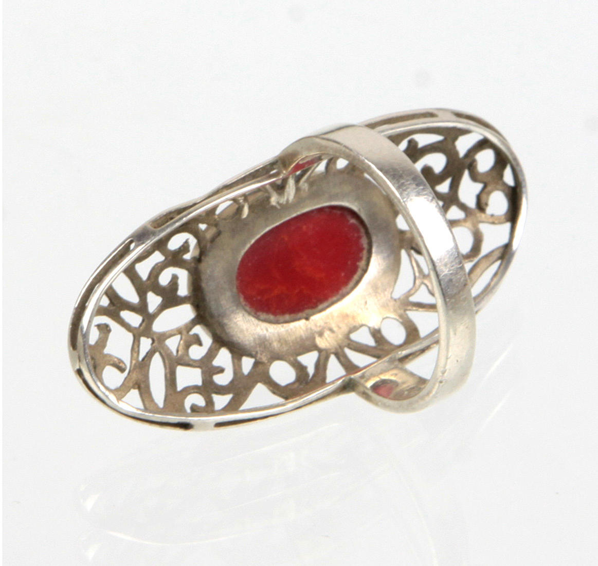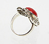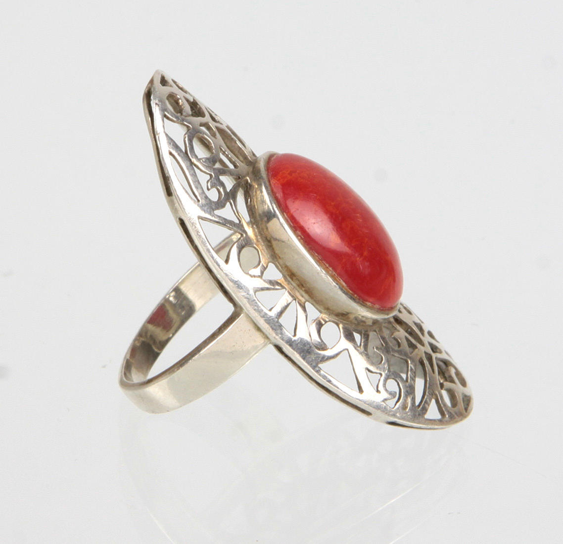 Ring in Silber 925 gearbeitet, ovaler durchbrochen gearbeiteter Ringkopf, dieser mit einem ovalen Koralle-Cabochon besetzt, Ringgröße 59, Ringkopf 40 x 19 mm, Gewicht 6,6 Gramm.