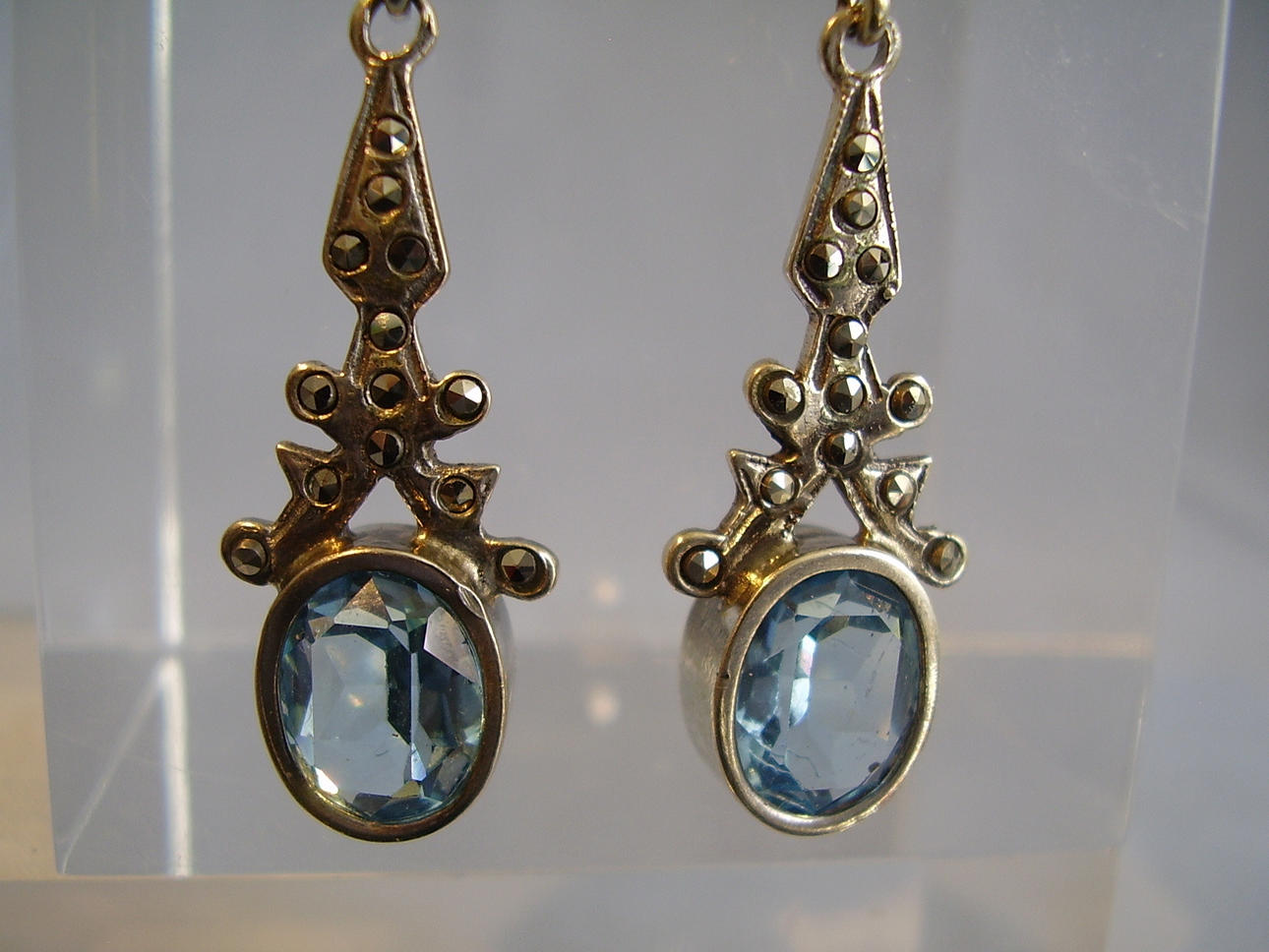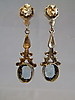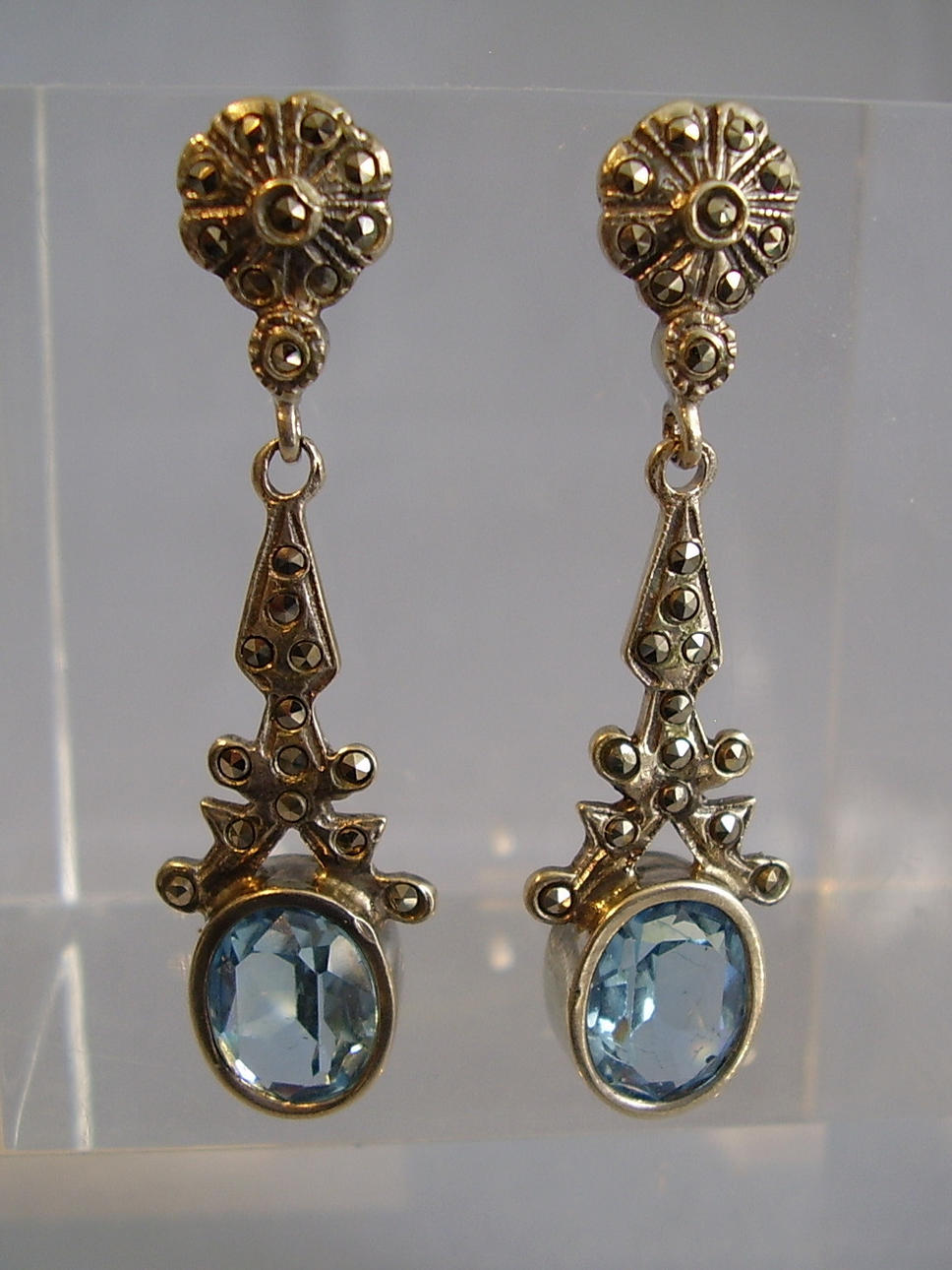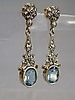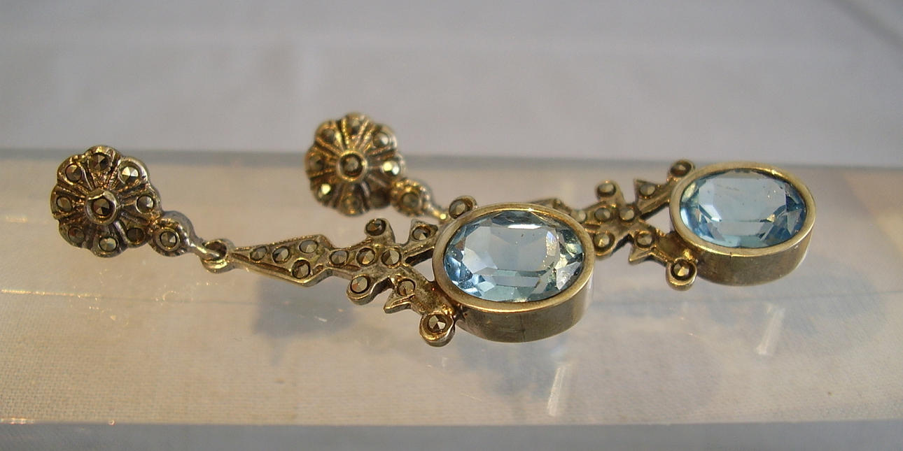 Sie sind als Ohrstecker in Rosettenform ausgeführt und mit Markasiten besetzt. Darunter sind mehrfach gegliederte Abhängungen beweglich angebracht, die mit oval facettierten, geprüften Blautopasen besetzt sind.