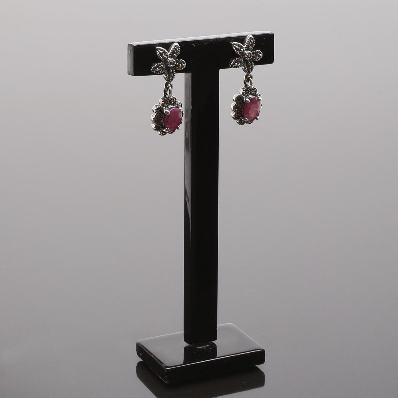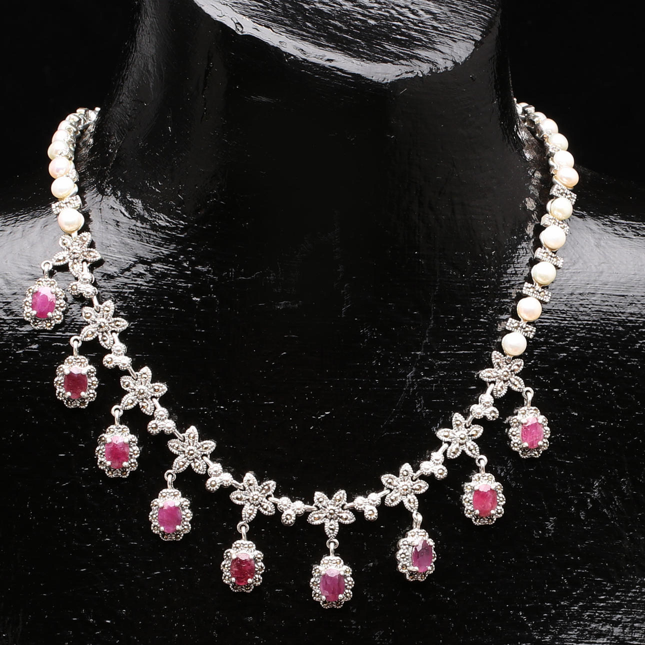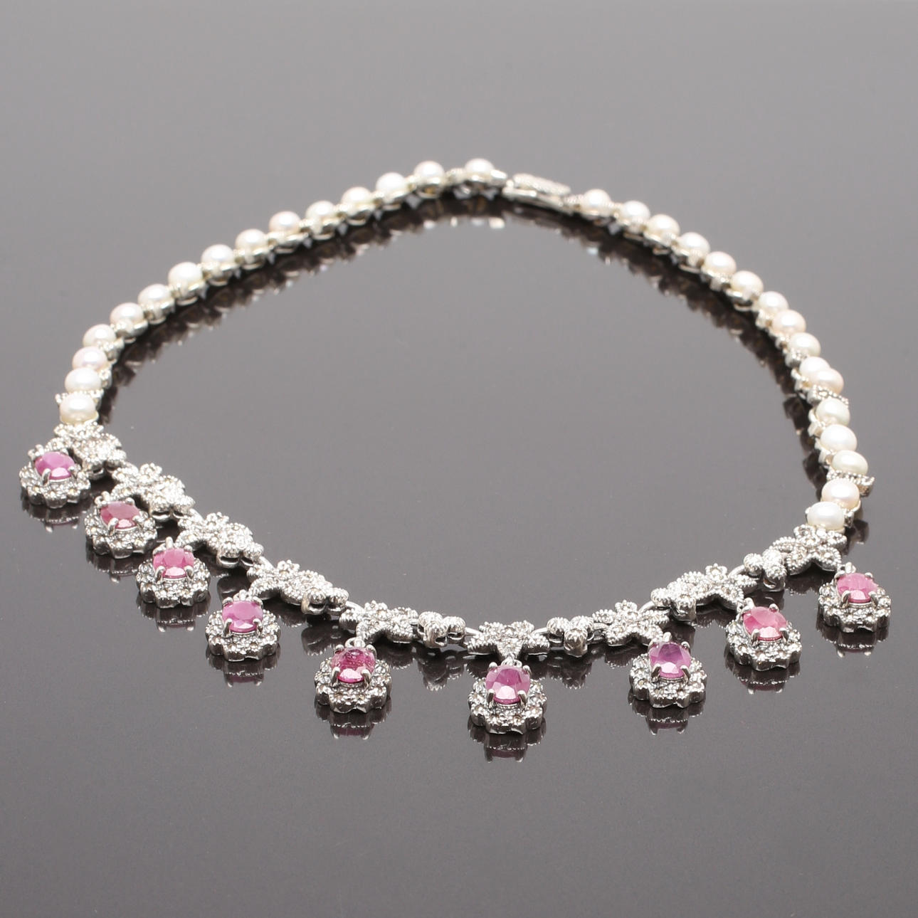 SCHMUCKSET, Silber, Perlen, Markasit und rote Steine.
