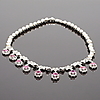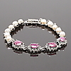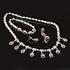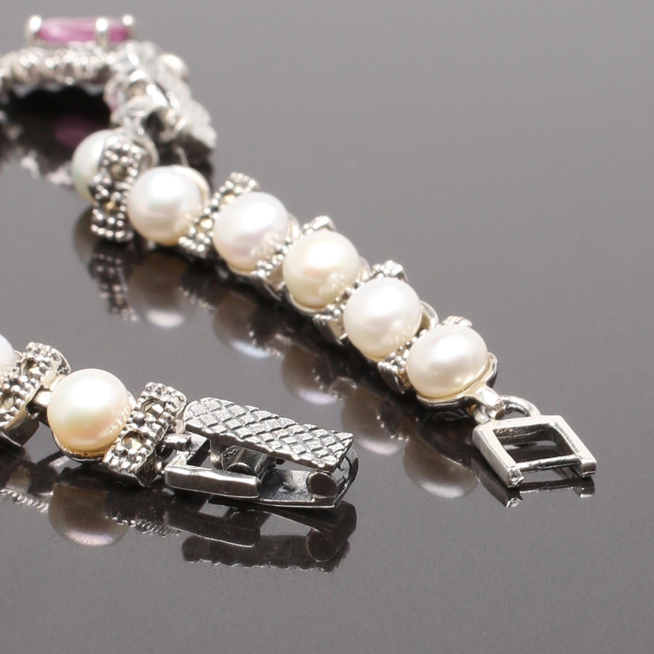 Armband, Halskette, Ring und Ohrringe aus Sterlingsilber mit Zuchtperlen, Markasiten und roten Steinen Gepunzt mit 925 Armbandlänge: 19,5 cm Kettenlänge: 47 cm Ringgröße: 53,5/17 Gesamtgewicht ca. 105 Gramm.