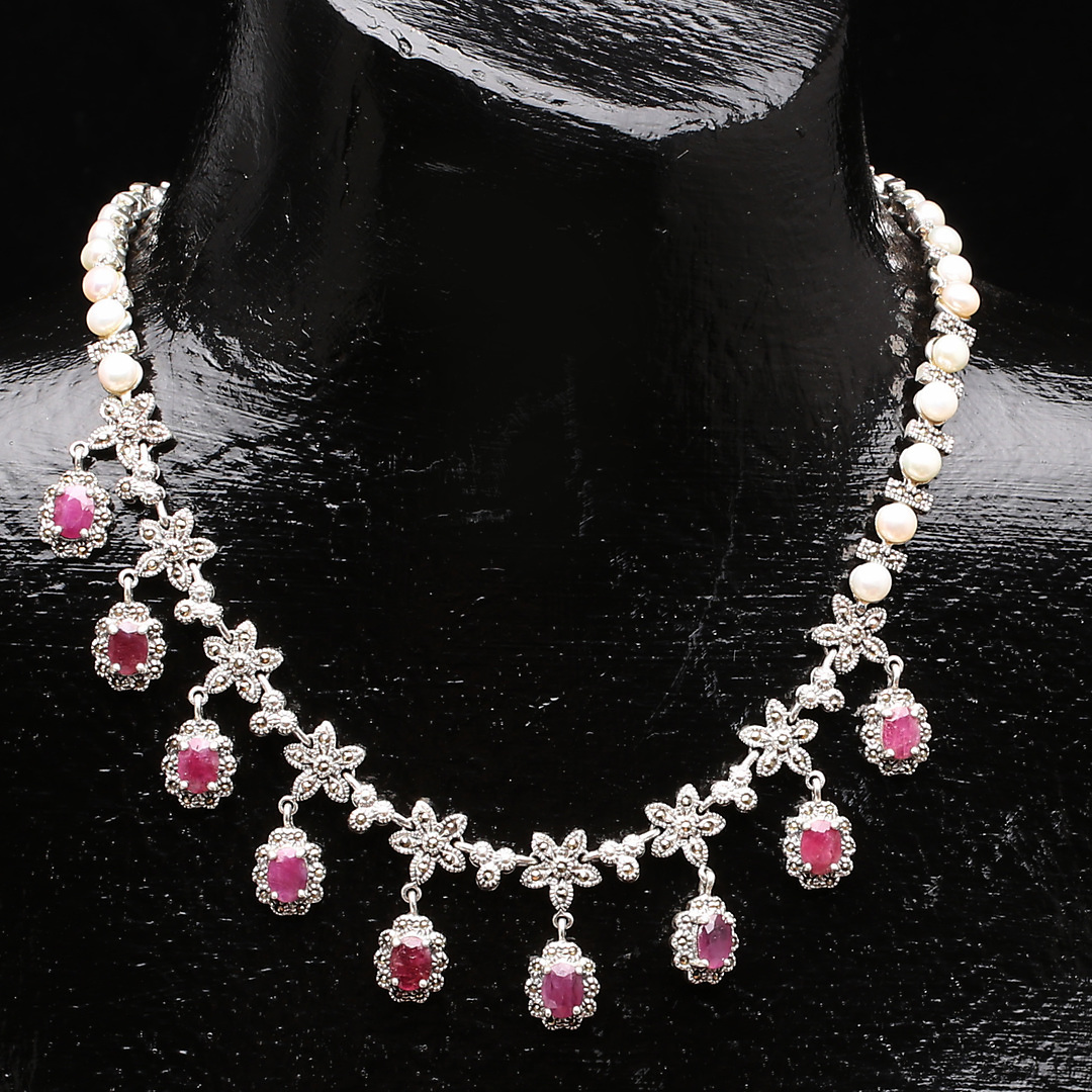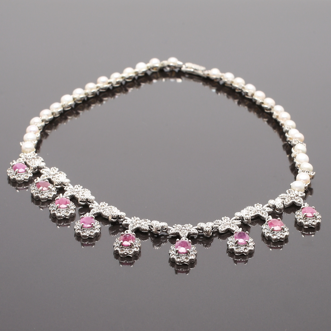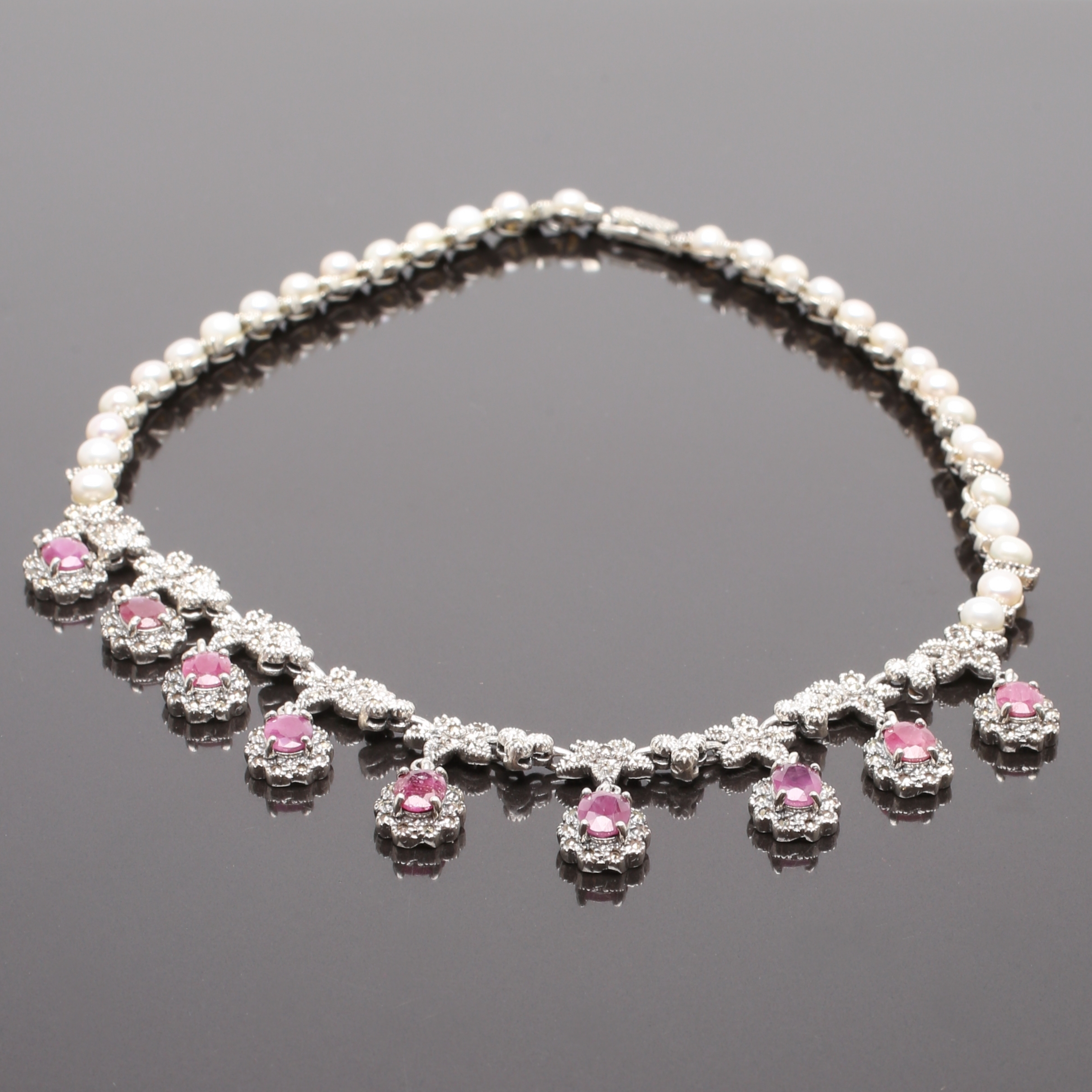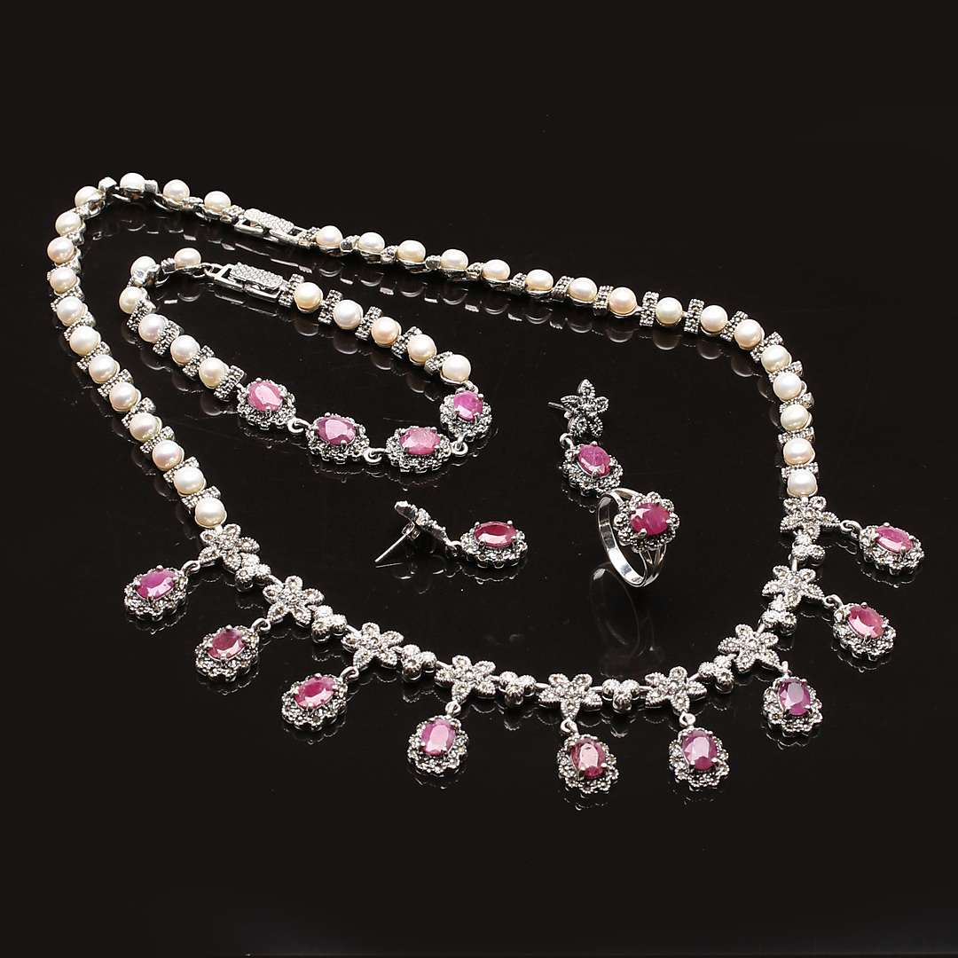 828475. SCHMUCKSET, Silber, Perlen, Markasit und rote Steine.