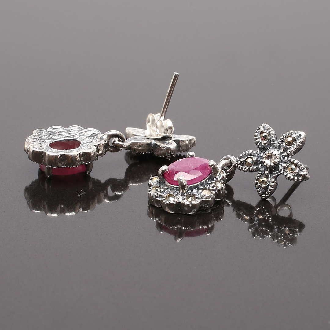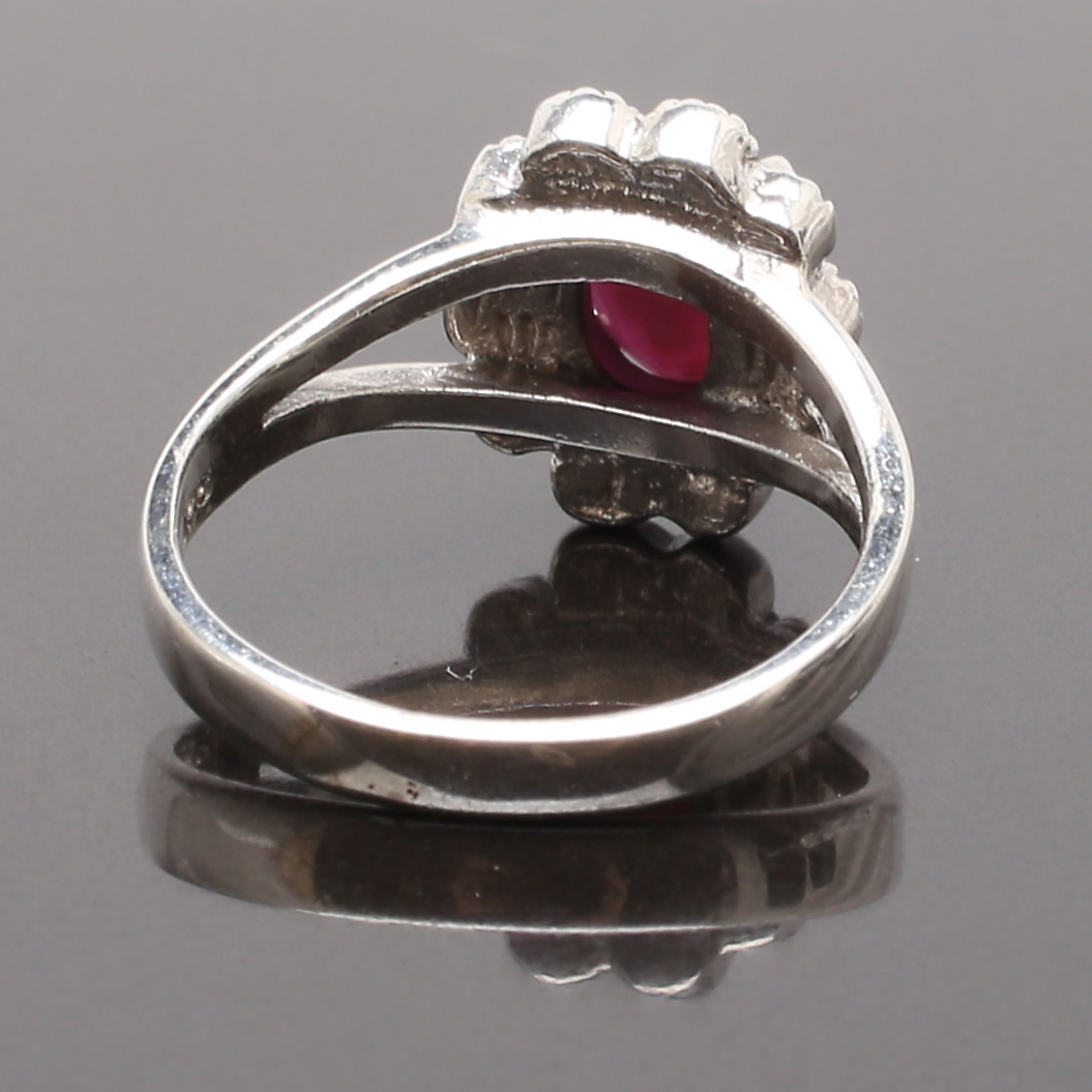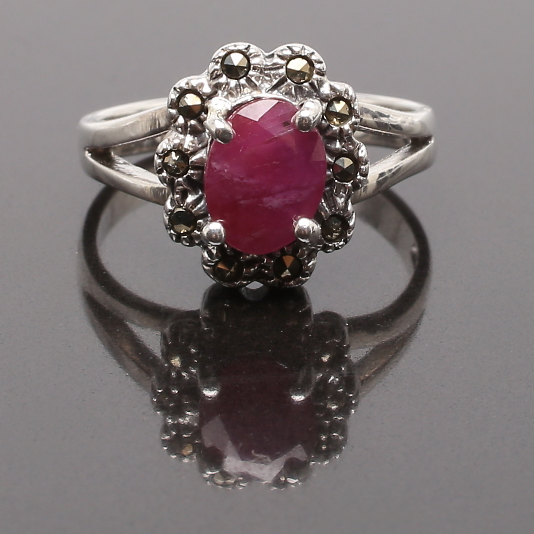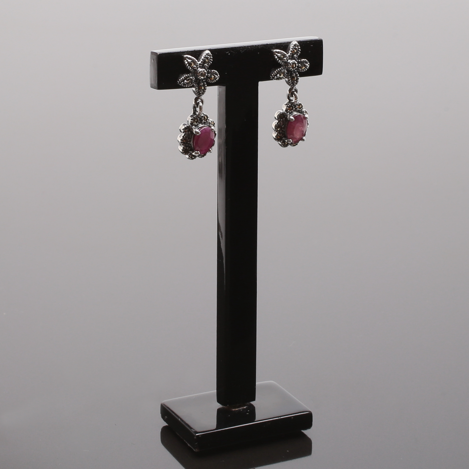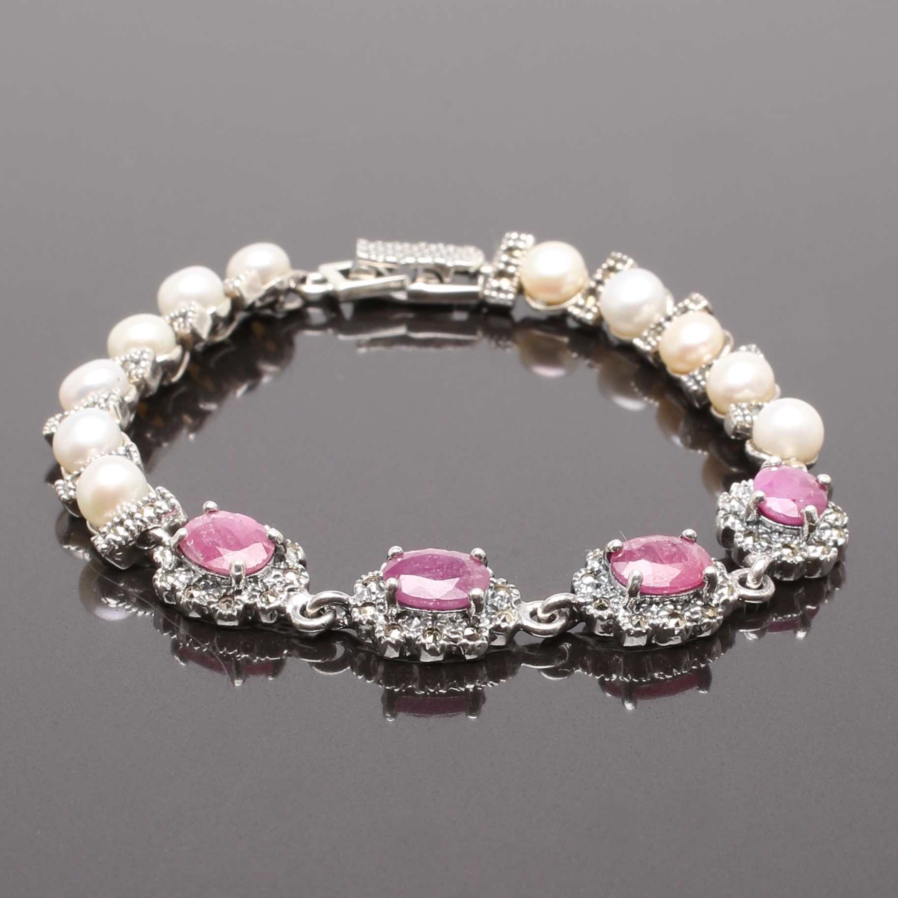 828475. SCHMUCKSET, Silber, Perlen, Markasit und rote Steine.