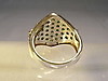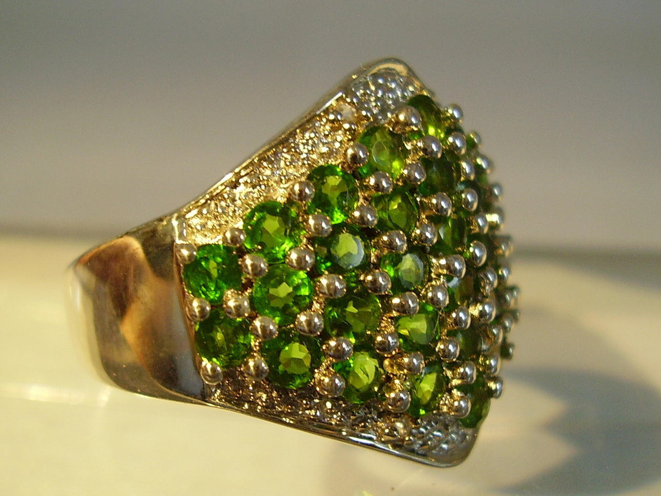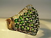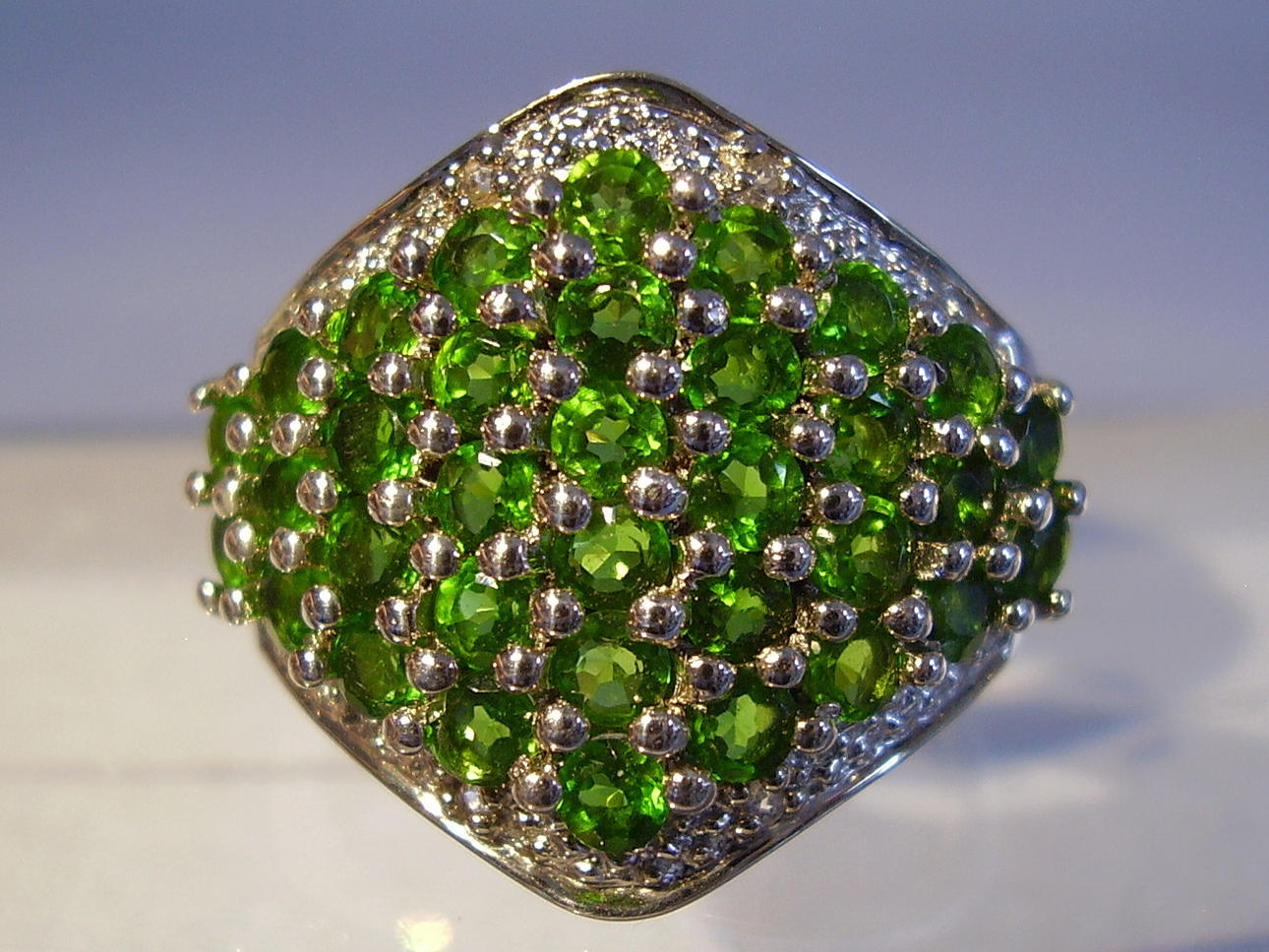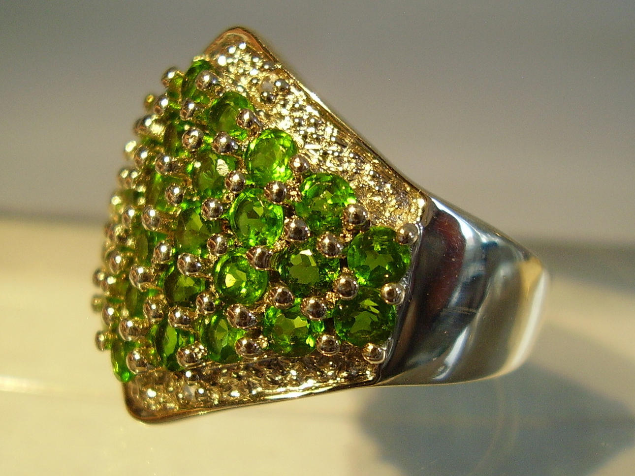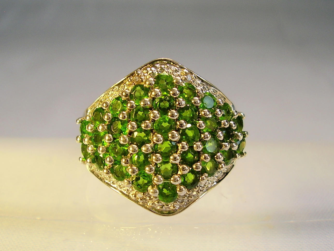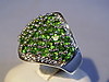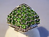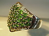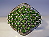 Rautenförmiger Ringkopf mit rund facettierten leuchtend grünen, natürlichen Chromdiosiden besetzt. Darum Entourage aus rund facettierten weißen Topasen.