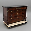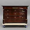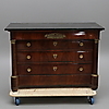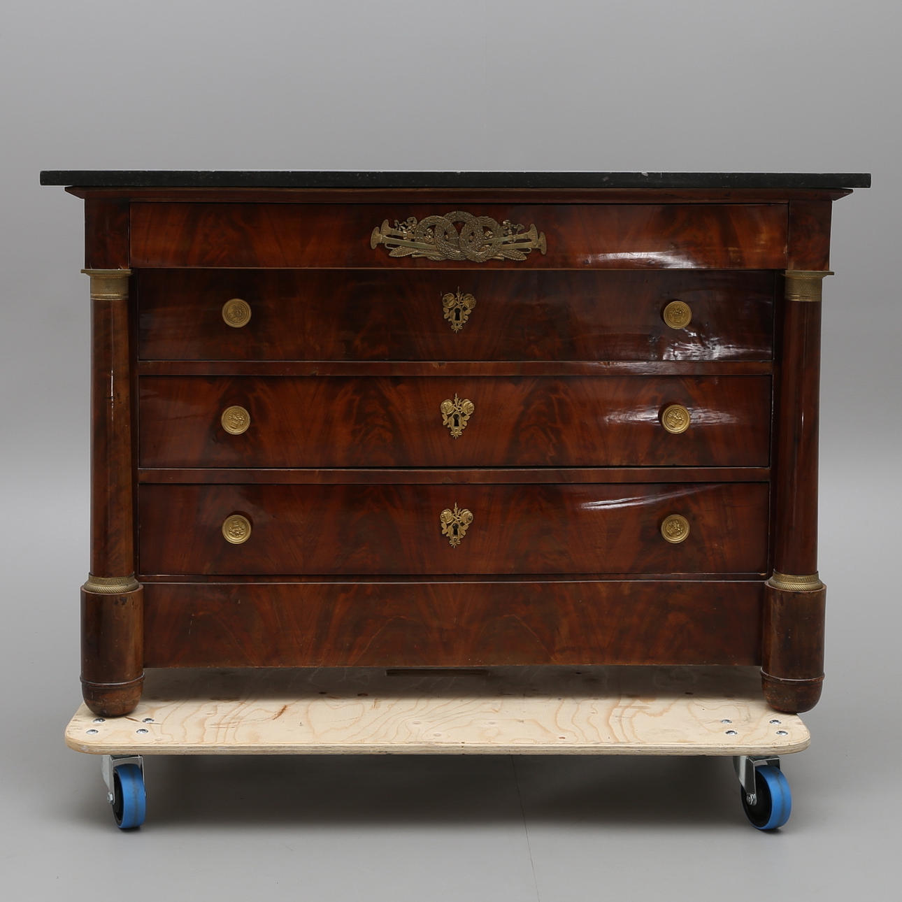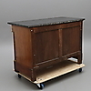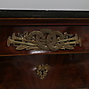 Mahagoni furniert, Zierbeschläge aus Bronze und Messing, Platte aus schwarzem Marmor. Höhe 89 cm, 131x62.