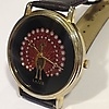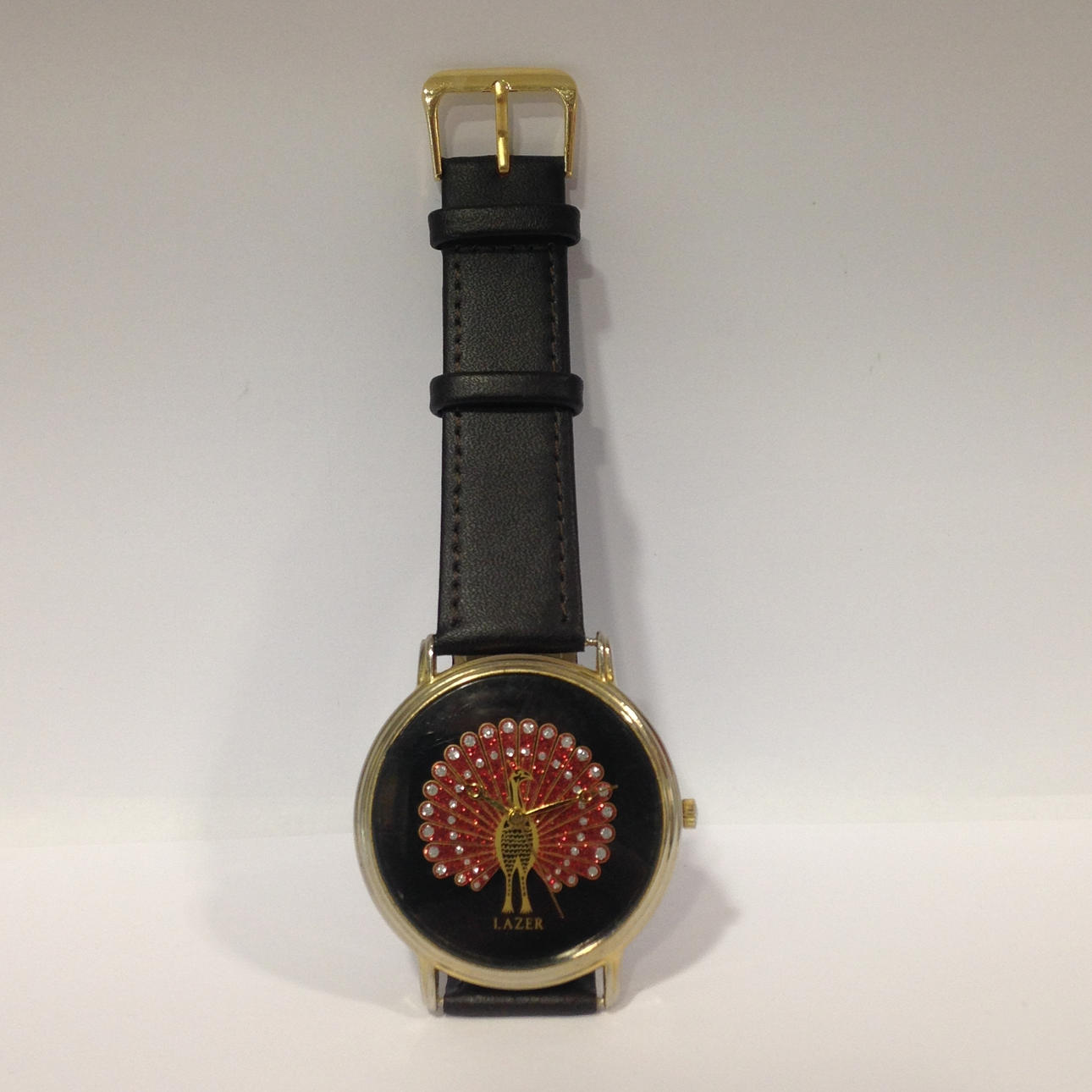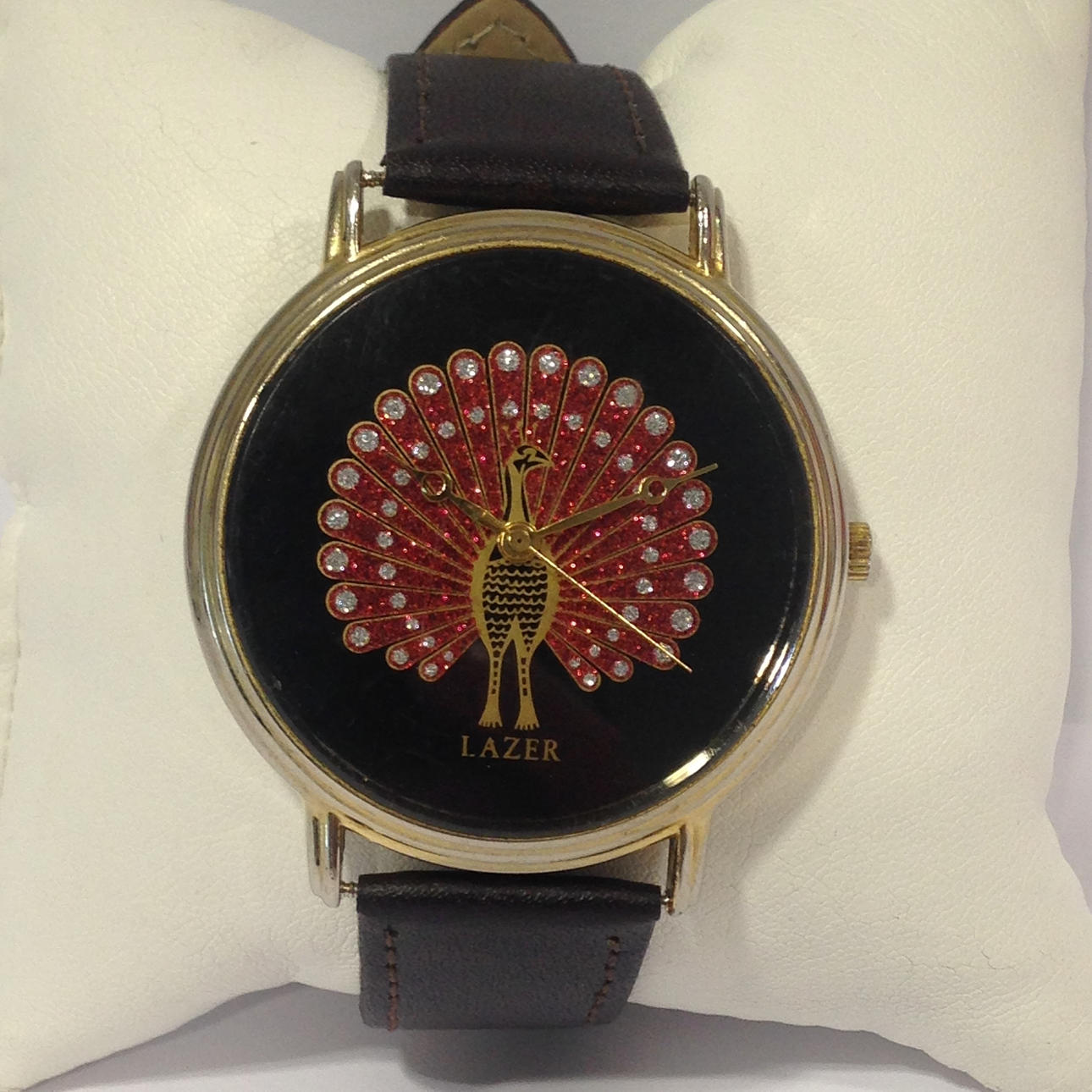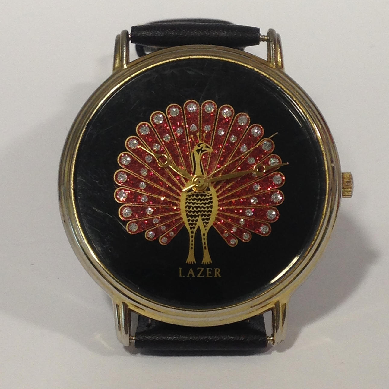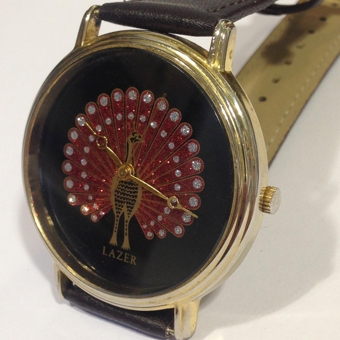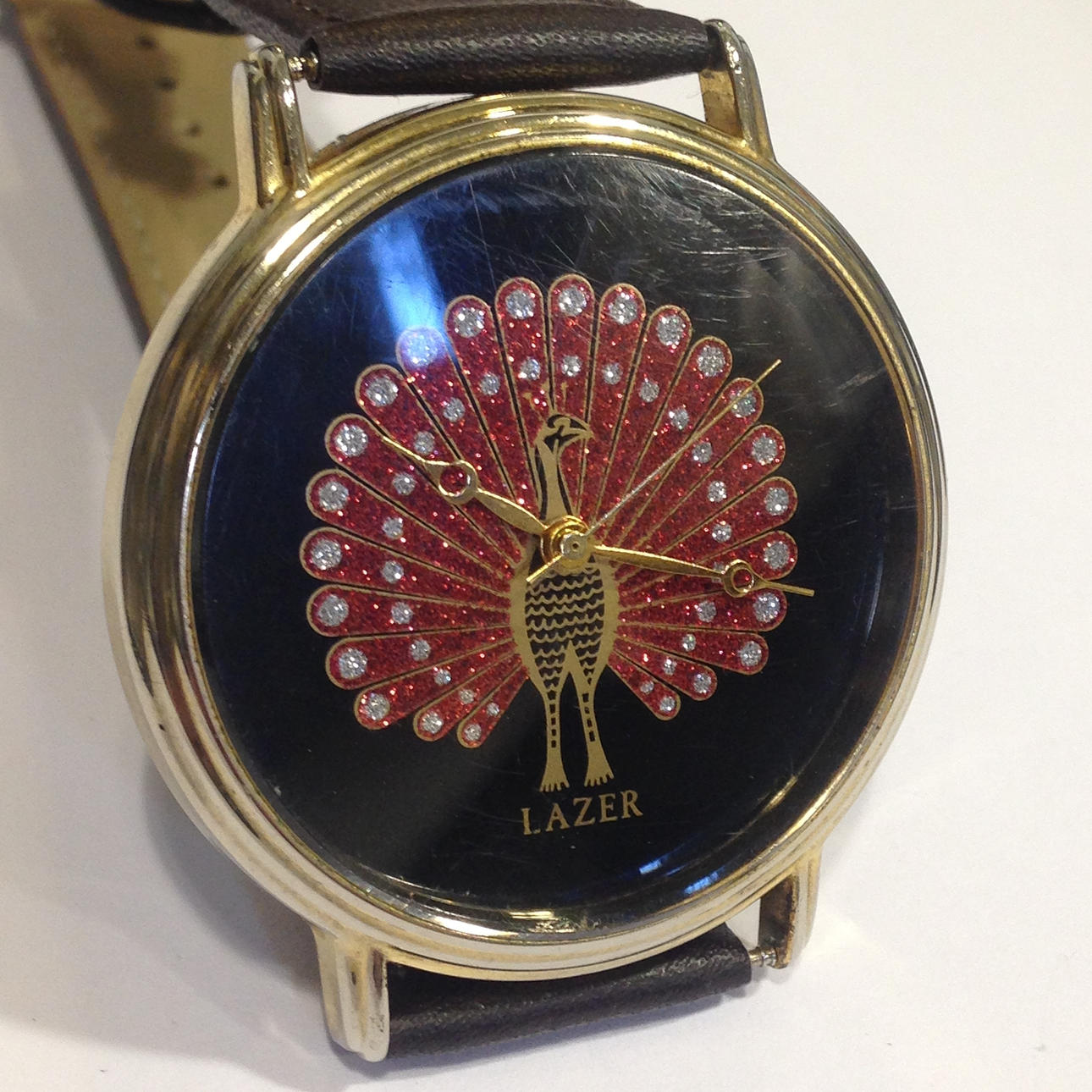Eine Lazer Armbanduhr mit Pfauengesicht.
