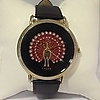Die Uhr hat ein juwelenbesetztes Pfauenmotiv auf dem Gesicht. Das Armband der Uhr ist aus Kalbsleder und wird mit einer Dornschließe geschlossen.