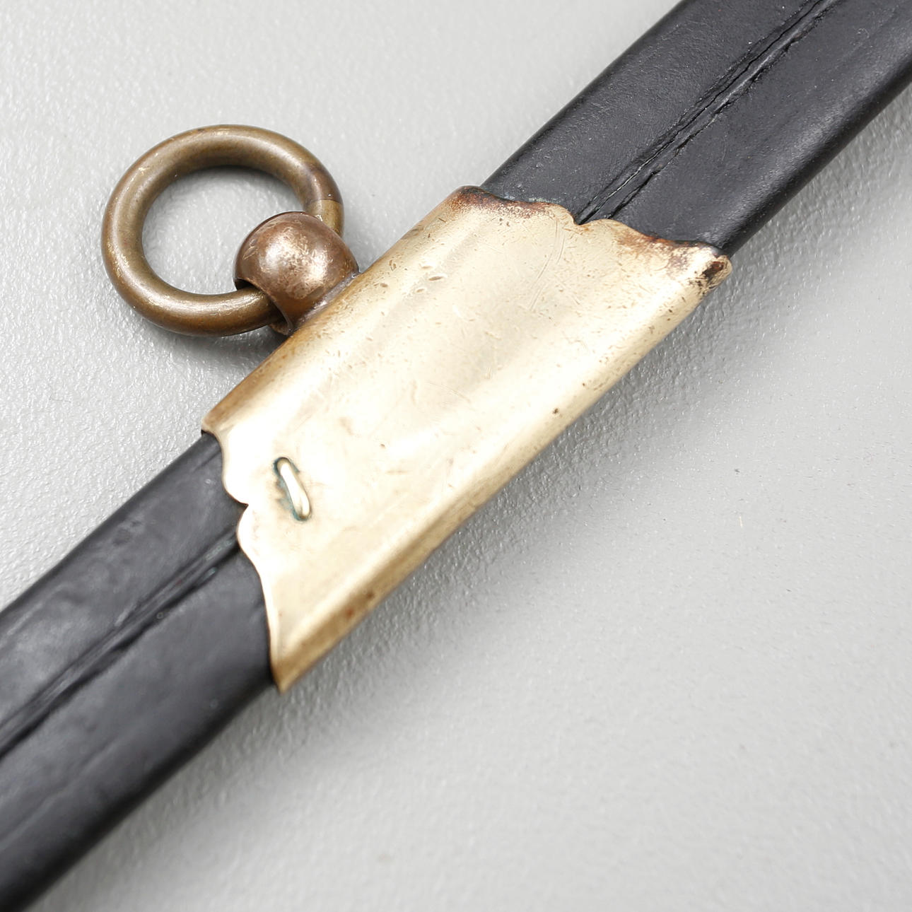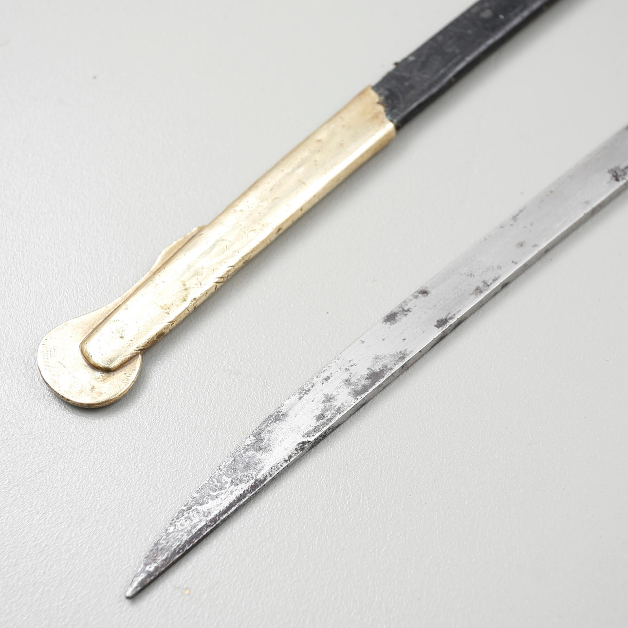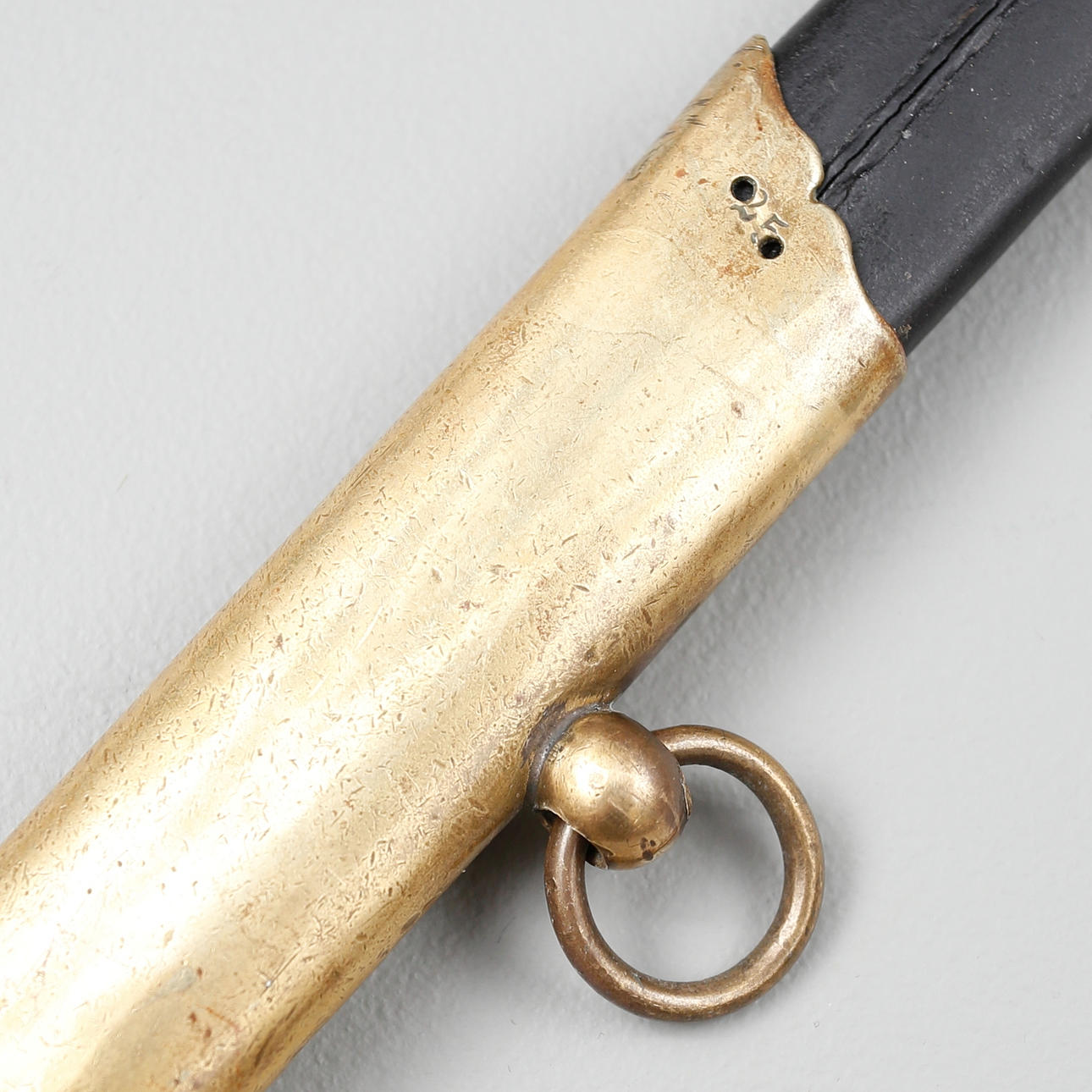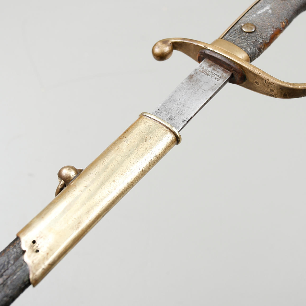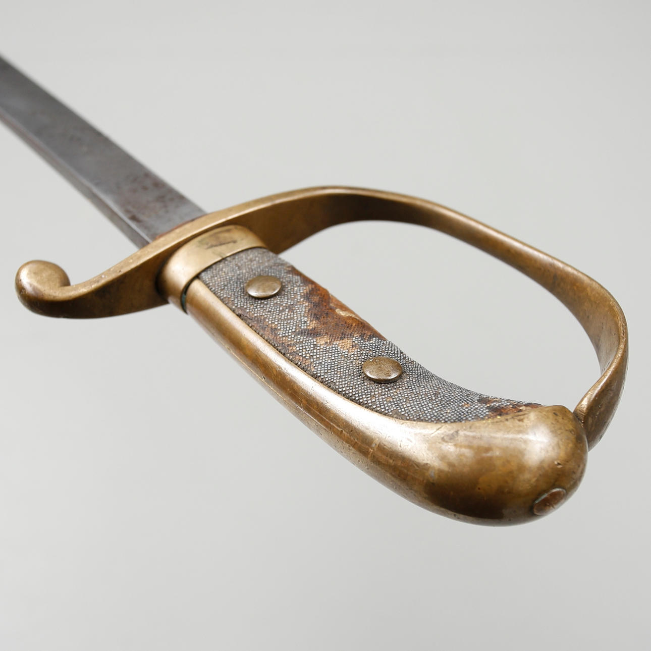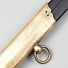 Polizeisäbel mit einem mit Hirschleder überzogenen Nudelholz und einem Trensenbeschlag aus Messing. Klinge gestempelt GE Svalling Rosenfors.