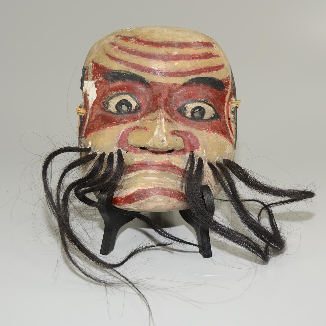 Es gibt Gebrauchsspuren und einige Schäden in der Holzmaske.