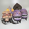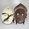 Fünf Masken aus Holz und Gips, 16-28 cm hoch. Holzmaske mit Schnurrbart hat folgenden Text: Japon Asahiva Saburo.
